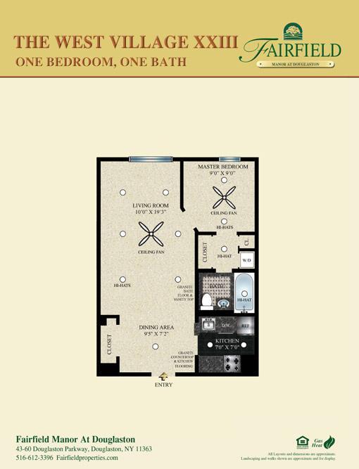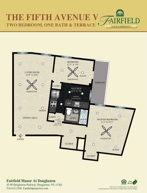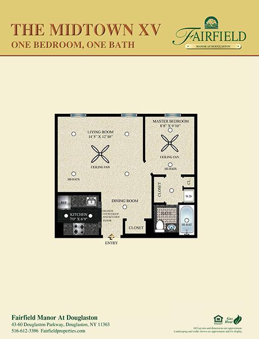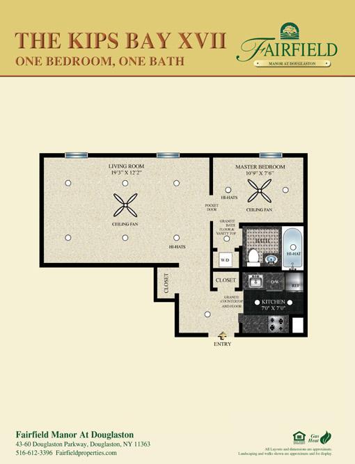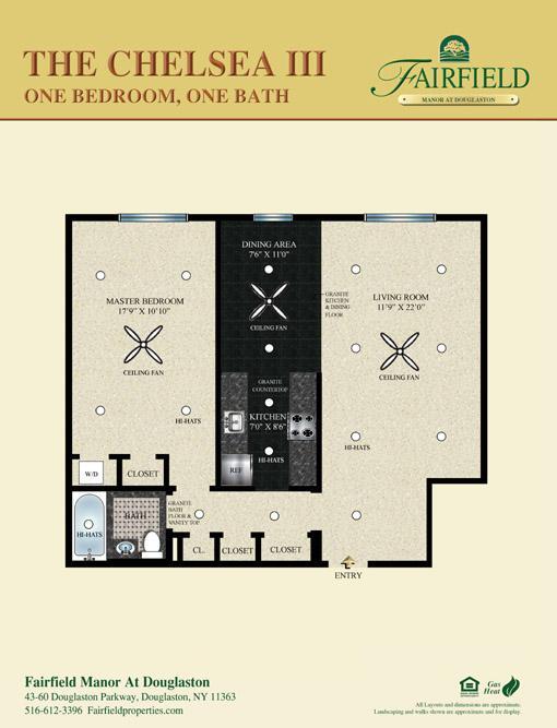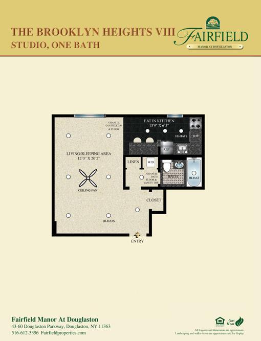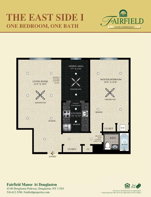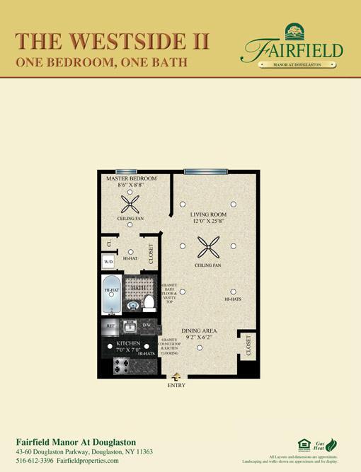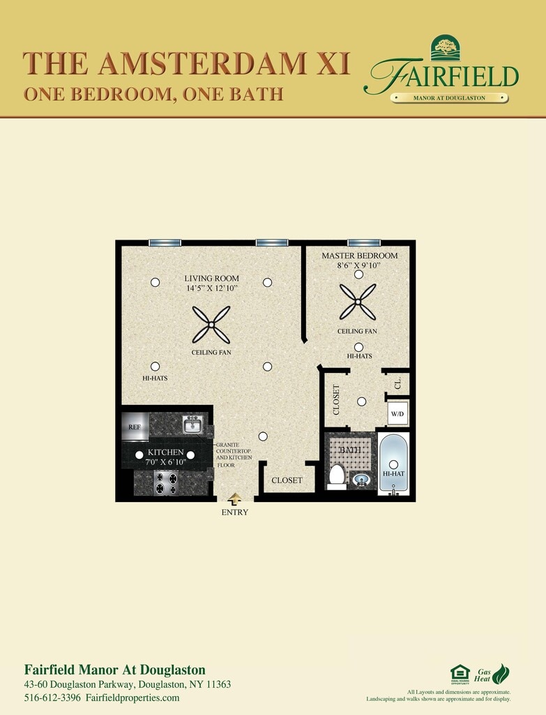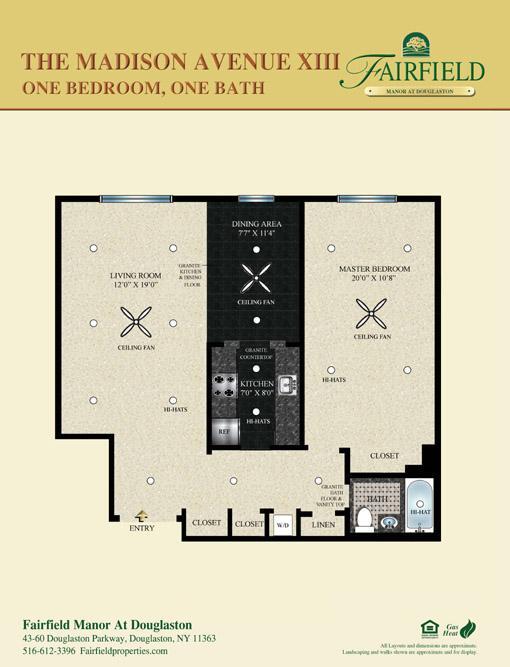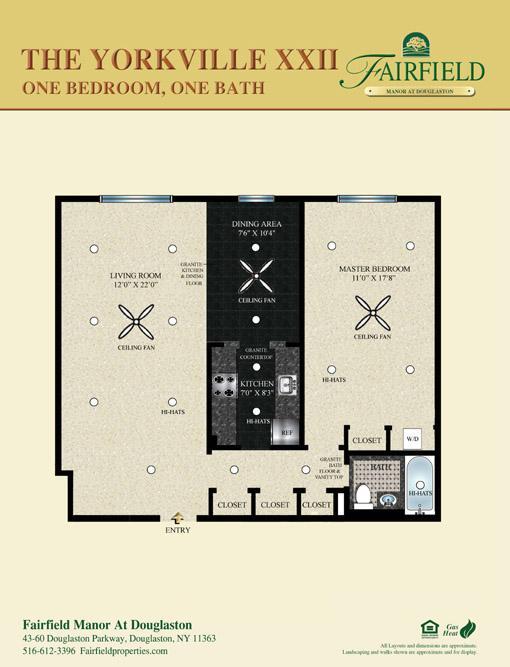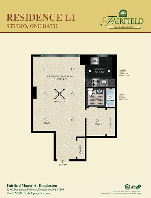Fairfield Manor At Douglaston. A Fairfield Properties a five-star Manhattan style high-rise at Douglaston. Queens, New York. Lobby with intercom, elevator. 20 minutes to NYC.Luxurious -studio, -1 bedroom, -2 bedroom residences. Granite kitchen and bath. Granite countertops, backsplash, flooring. Cherry cabinets, undermount lighting, Stainless steel appliances, hardwood floors, gray paint, AC, high-hat lights, ceiling fans, window treatments, stackable non-vented washer/dryer.