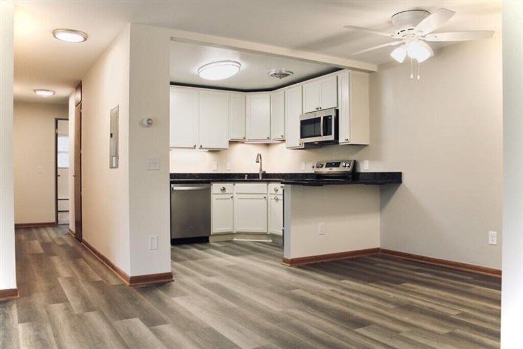 Royal Arms Apartments is in the most desirable location, with easy access to all the amenities and attractions that Madison has to offer. Whether you're eager to explore the lively downtown, relax at the scenic parks and lakes, or enjoy a variety of dining and shopping experiences, Royal Arms offers the perfect location and convenience to make it your ideal home. Our recently remodeled spacious 2-bedroom, 1-bathroom and 2-bedroom + den apartments are located in the Sunset Village Neighborhood directly behind the Hilldale Mall. These apartment homes were thoughtfully designed with modern elegance, offering a comfortable and inviting living space. The first-floor units feature hardwood floors throughout, while the second-floor apartments offer luxury vinyl plank (LVP) flooring, with cozy carpet in the bedrooms. The kitchen features granite countertops that provide a sleek, durable surface, with white cabinets for a clean, modern look. This kitchen is equipped with smart stainless-steel appliances, including an ice maker and dishwasher, combining both style and functionality. In select apartments, you'll also find in-unit washer/dryers, making laundry day effortless. Our dedicated on-site management team is always available to assist you with any questions or concerns you may have. We include surface parking, with an additional garage and covered parking available. Additionally, a storage unit is included in the basement, offering you ample space to store your belongings.
