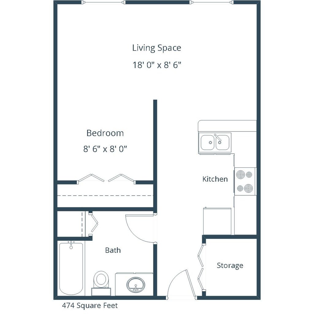 Efficiency 01A - Floorplan 1 Apartment Unit: 03-208Apartment Model: Efficiency 01AStudio, 1 Bath, 474 sq ftAvailable NowApartment Unit: 01-206Apartment Model: Efficiency 01AStudio, 1 Bath, 474 sq ftAvailable Now1 Bedroom