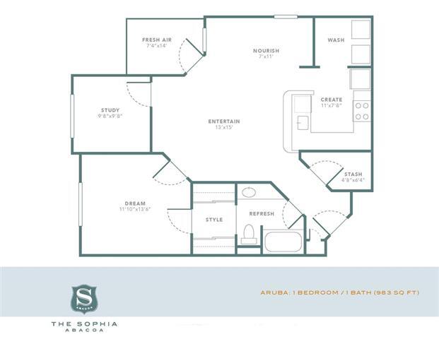 Aruba - Floorplan 1 Apartment Unit: 10-204Apartment Model: Aruba$2,6121 Bedroom, 1 Bath, 983 sq ftAvailable November 9, 2025Antilles