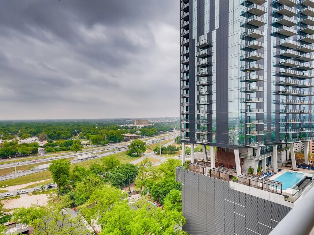 Enjoy downtown living at it's best! Wake up to East facing green views from your private balcony. This spacious one bedroom/one bathroom + den/office/flex space offers plenty of space to work from home! Enjoy a fully equipped kitchen with stainless steel appliances, granite countertops open to living room. Light hardwood floors are perfect for any decor! Dual vanity in bathroom with large walk-in marble shower. Plenty of storage in the master walk-in closet. Stackable washer/dryer in unit. Building offers onsite concierge, roof top pool and patio space. Need to take a break from it all? Enjoy Easy access to the hike and bike trail, steps away from the Rainey Street district bars, hotels and nightlife!