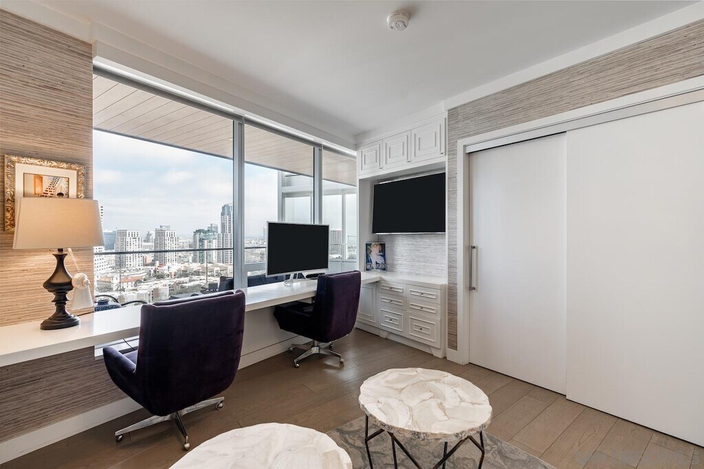 Step into the most exclusive turnkey luxury rental in Downtown San Diego—the only available Estate-level residence at Pacific Gate offered for lease. Furnished and available February 2026,Estate 3301 delivers an unparalleled coastal lifestyle with sweeping ocean and bay views paired with sophisticated modern design. This exceptional residence features three bedrooms plus a den/office,three bathrooms,and an expansive covered terrace,ideal for seamless indoor-outdoor living. Thoughtfully curated interiors showcase custom built-ins,striking sculptural lighting,and refined details throughout. The primary suite is a true retreat,complete with a beverage refrigerator,spa-like bath,and a beautifully designed walk-in closet. Each additional bedroom offers generous proportions,stunning views,and spacious closets. Every element of this home has been meticulously designed to offer comfort,elegance,and ease—from high-end finishes to turnkey furnishings that create a truly elevated living experience. Residents of Pacific Gate enjoy resort-style,full-service amenities,including a 45’ yacht share,chef concierge,guest suite,pool terrace with private cabanas,residents’ lounge with catering kitchen,luxury car fleet,and a state-of-the-art fitness center with sauna and steam room. Ideally located just steps from the bay and moments from Seaport Village,the Rady Shell,and the new RaDD District,with world-class dining,cafés,and shopping at your doorstep—this is luxury coastal living at its finest. MLS# 2601253