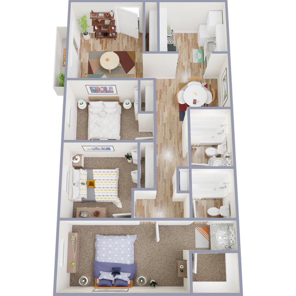 Apartment Model: Three Bedroom, 2 Bath. One Month Free!!*$1,4253 Bedroom, 2 Bath, 1200 sq ftAvailable NowFloorplansPhotos![]()