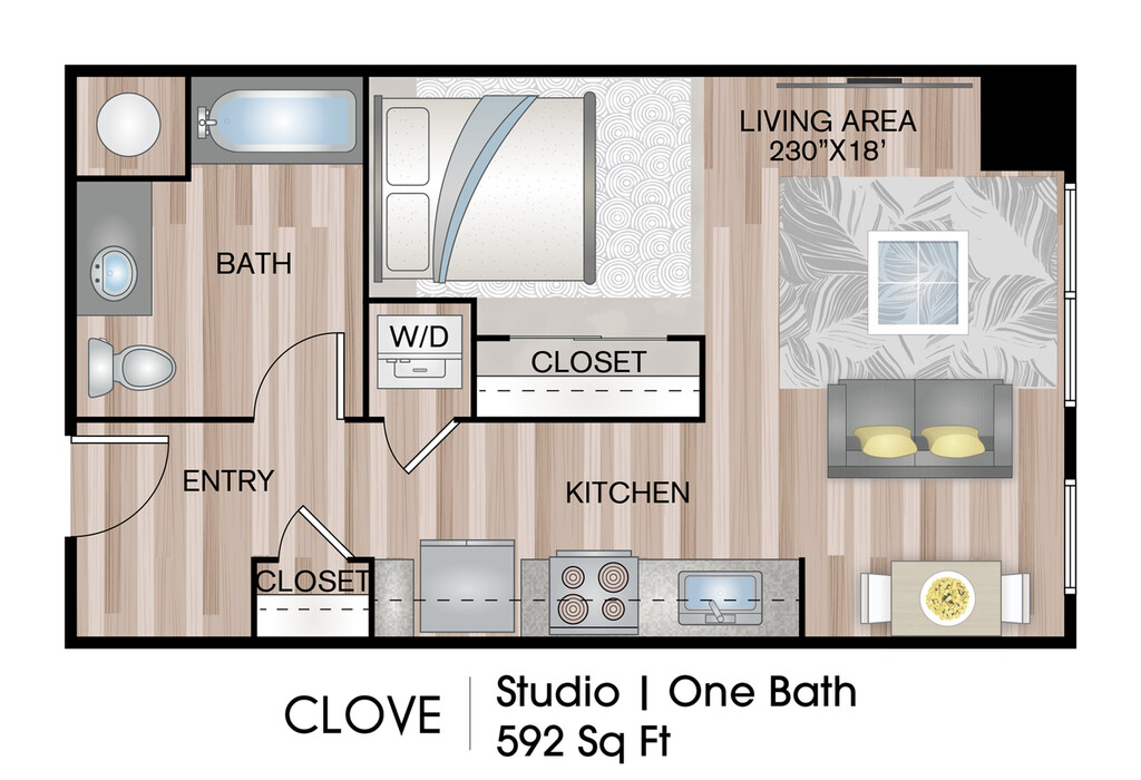 Modelo de apartamento: CloveLlame para PreciosEstudio, 1 Baño, 592 sq ftNo Disponible![]()