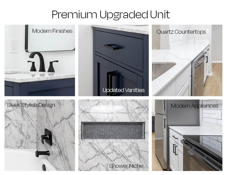 - Cocinas con diseños abiertos, gabinetes personalizados en blanco o tostado, encimeras de cuarzo o granito y protector contra salpicaduras.
