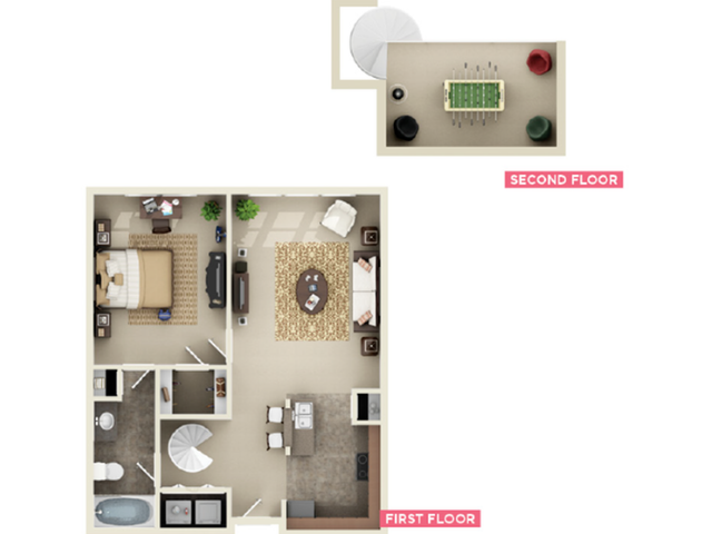 Modelo de apartamento: 1x1 LoftDesde $1,2101 Dormitorio, 1 Baño, 832 sq ftDisponible Ahora![]()