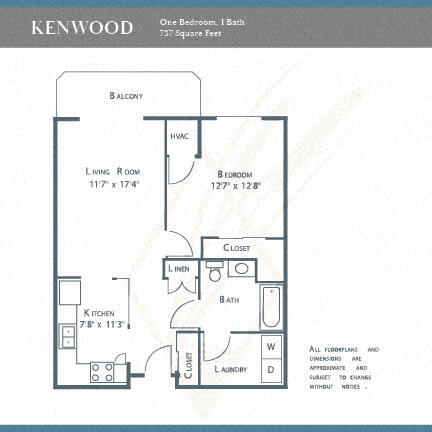 Modelo de apartamento: Kenwood - ACCDesde $1,5701 Dormitorio, 1 Baño, 737 sq ftDisponible April 1, 2026Los planos son representaciones artísticas. Todas las dimensiones son aproximadas. El producto y las especificaciones reales pueden variar en tamaño o detalle. No todas las características están disponibles en cada vivienda en alquiler. Por favor, consulta con un representante para obtener más detalles.