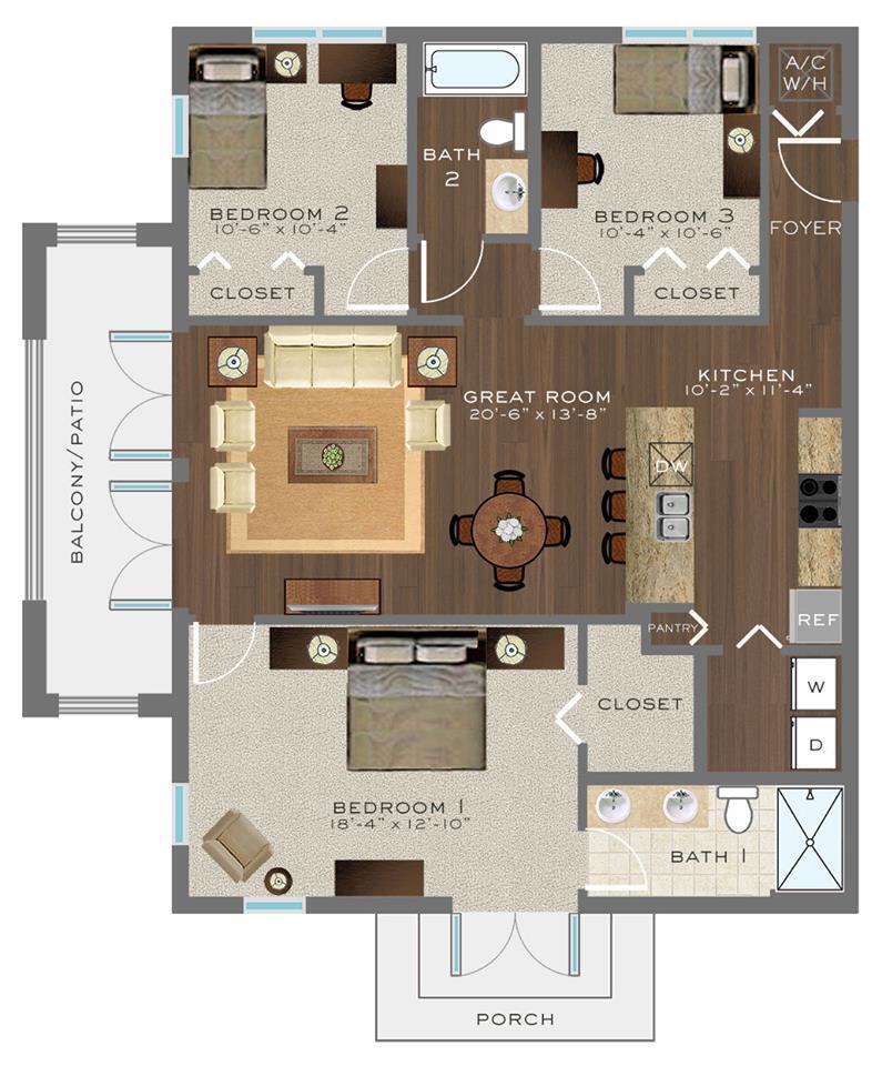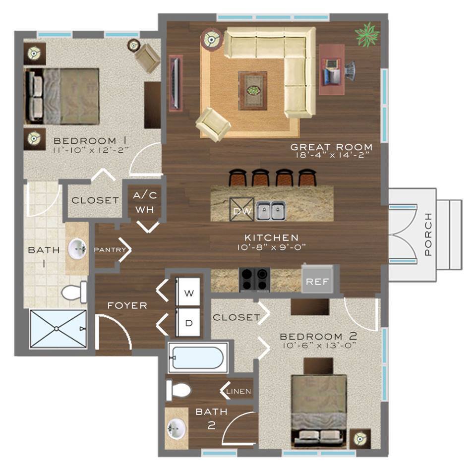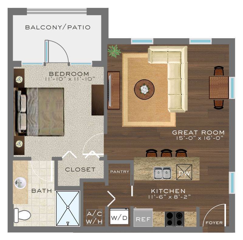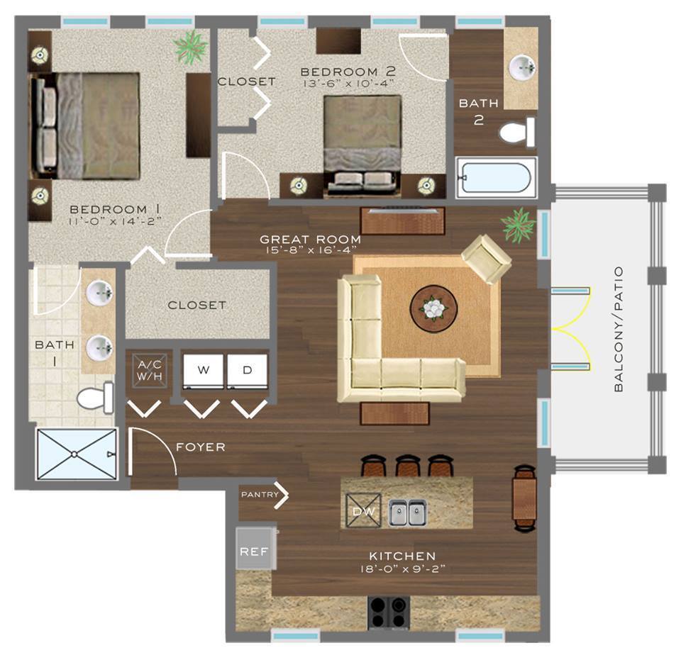 Modelo de apartamento: BridgewaterDesde $1,6091 Dormitorio, 1 Baño, 752 sq ftDisponible Ahora![]()