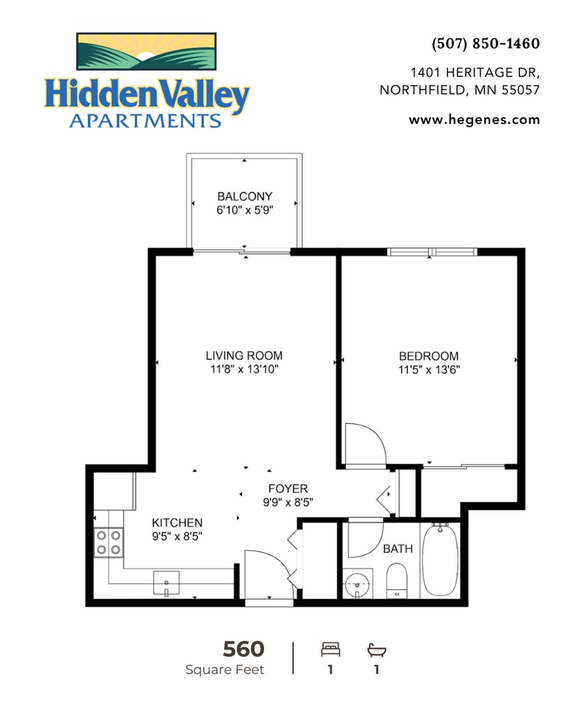 Modelo de apartamento: HV 1 BR STD$9001 Dormitorio, 1 Baño, 560 sq ftDisponible February 20, 2026PlanosFotos![]()