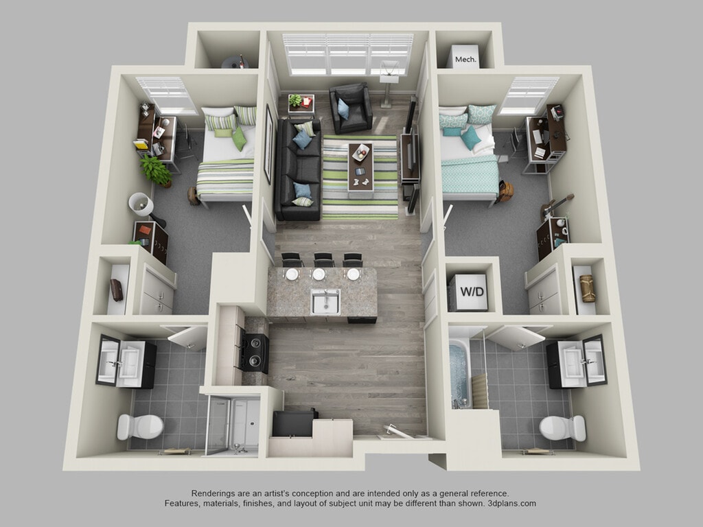 Modelo de apartamento: CharlotteDesde $1,0303 Dormitorios, 2 Baños, 1252 sq ftDisponible August 21, 2026Los planos son representaciones artísticas. Todas las dimensiones son aproximadas. El producto y las especificaciones reales pueden variar en tamaño o detalle. No todas las características están disponibles en cada vivienda en alquiler. Por favor, consulta con un representante para obtener más detalles.