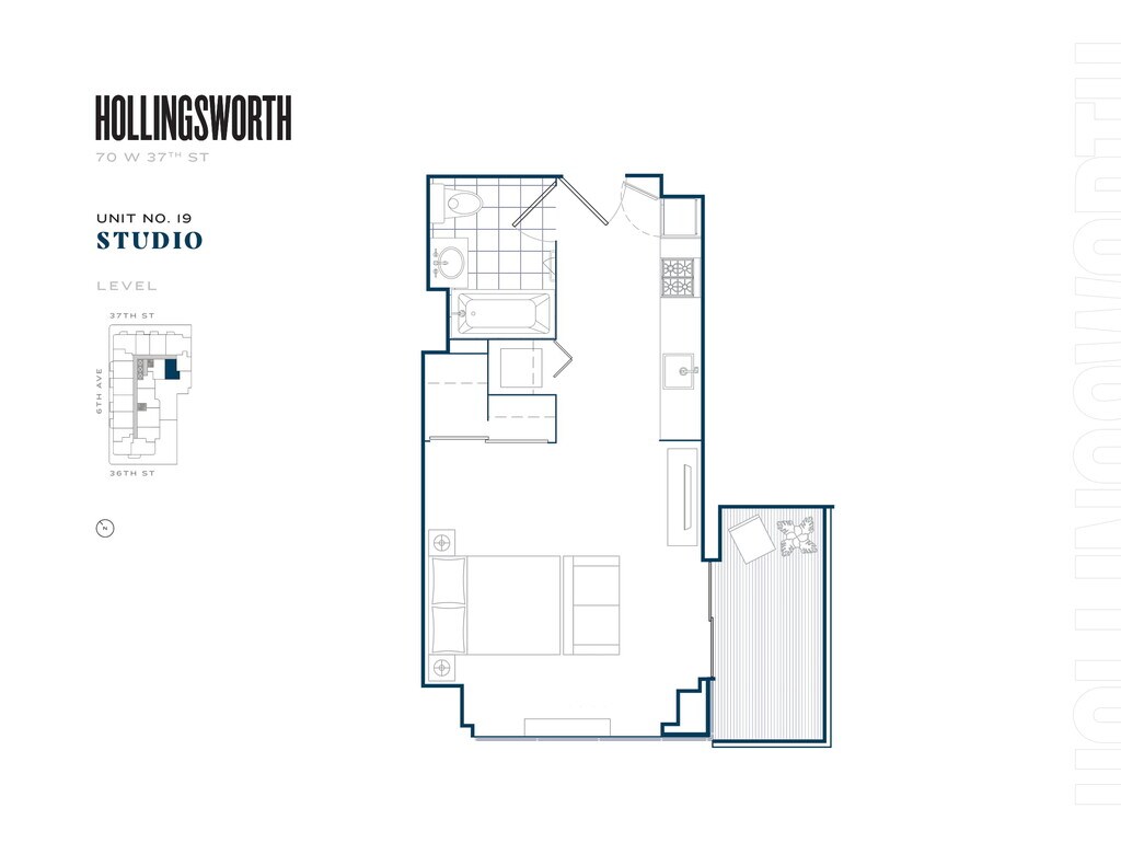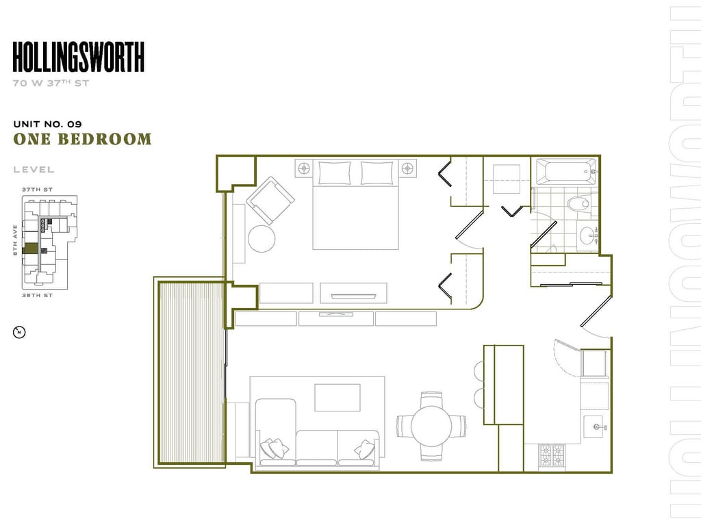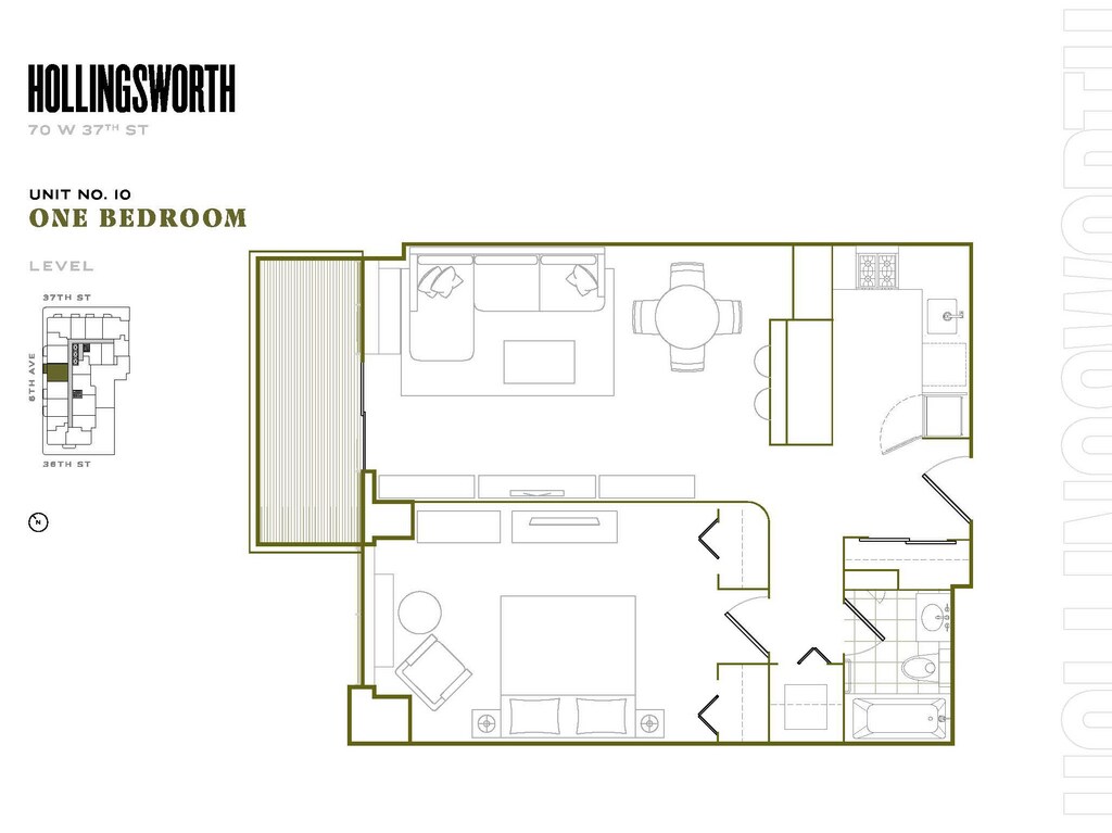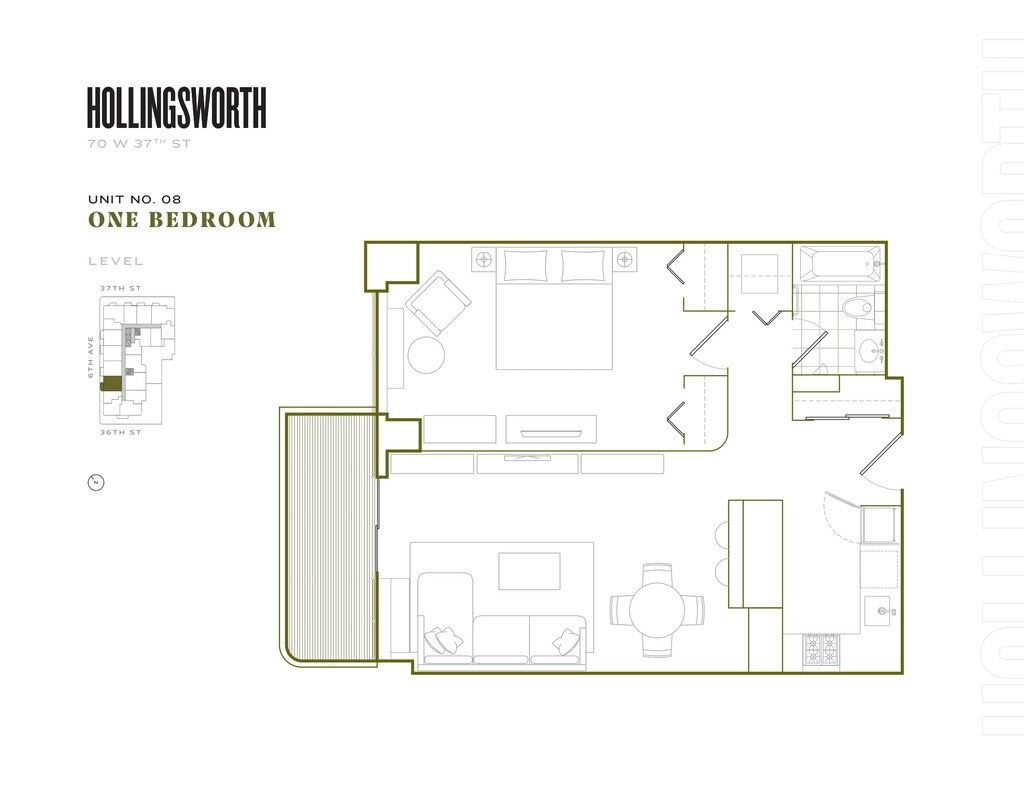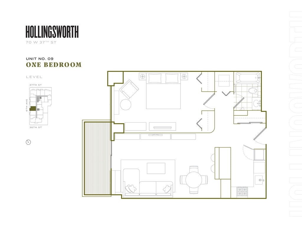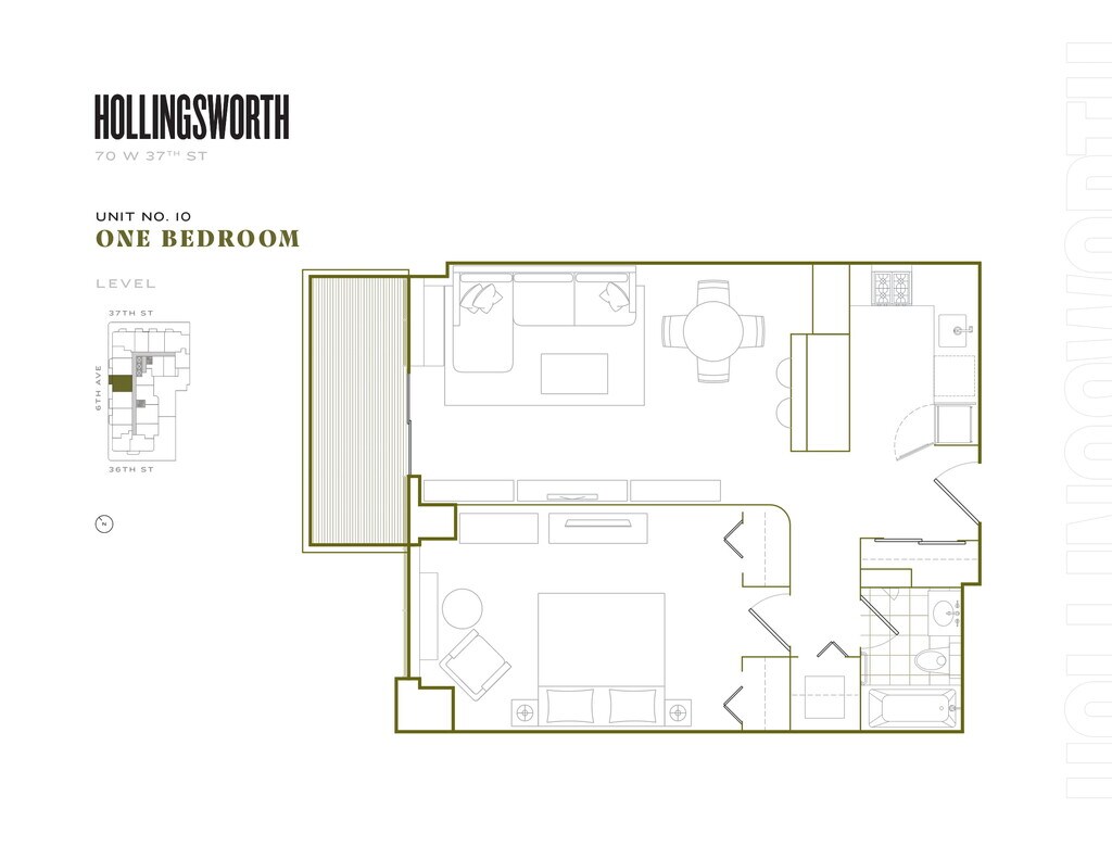 A pocas cuadras de Bryant Park, el Hollingsworth residencias querrás nada más en el centro de todo. Desde la inolvidable en la terraza de la azotea de arriba para cada amenidad de tus sueños a continuación, tu toda la emoción de Nueva York, actualizadas con un moderno estilo de vida en mente. Residencias cuidadosamente diseñadas para acomodar una cama King. Cocinas de chef profesional tienen cocinas a gas, refrigeradores y lavaplatos son de forma ordenada oculto detrás de gabinetes con paneles hechos a medida. Las cocinas también tienen gabinetes de cierre suave, encimeras de cuarzo y placa para salpicaduras de color gris, iluminación empotrada, y un amplio espacio de almacenaje. Cada residencia cuenta con lavadoras y secadoras por Bosch, con detalles de madera de roble, pisos de madera, duchas tipo lluvia y bañeras de inmersión de lujo con la mayoría de las residencias que cuenta con un espacio privado al aire libre.