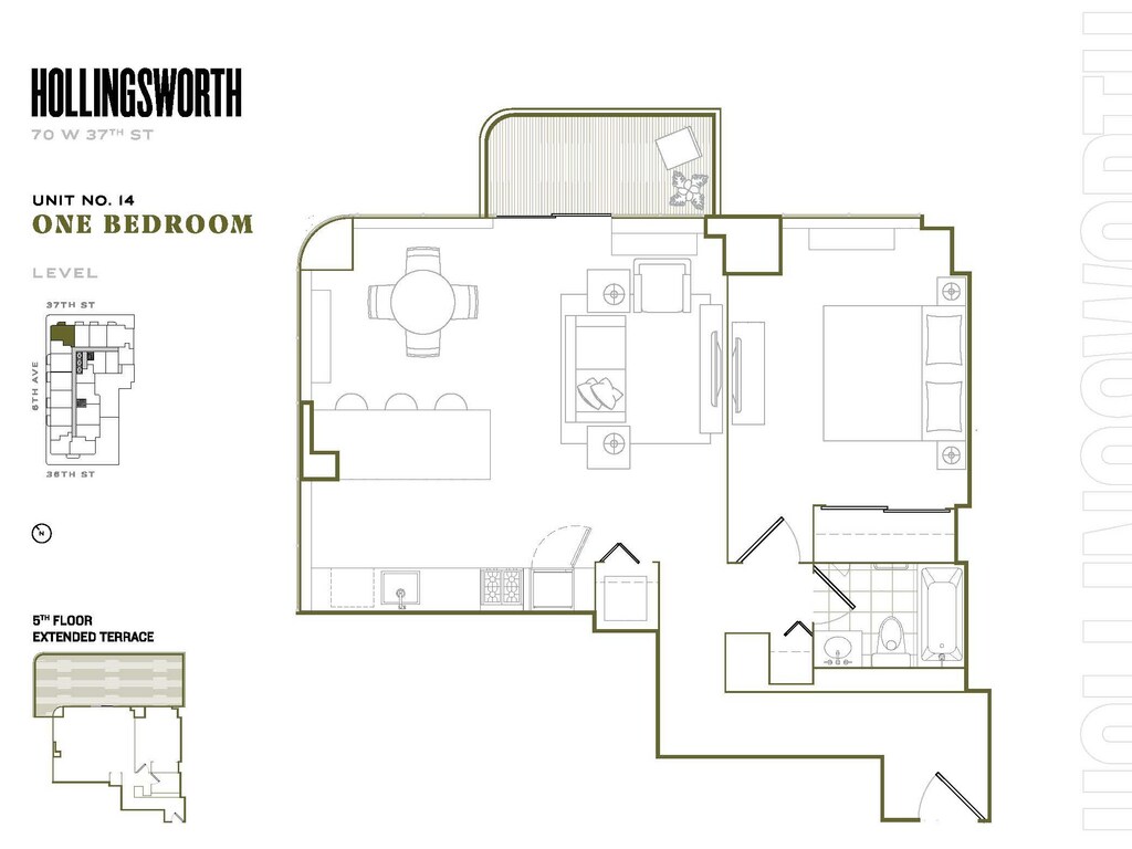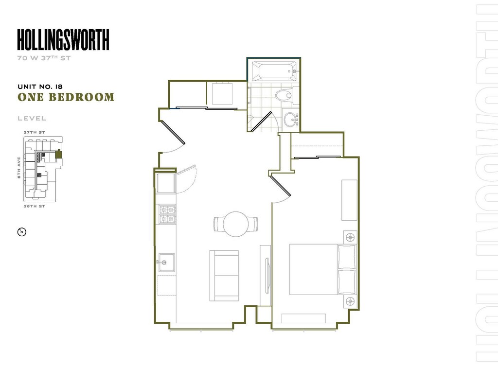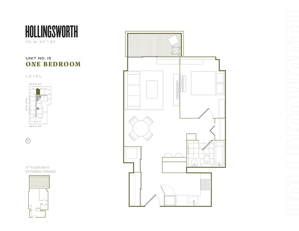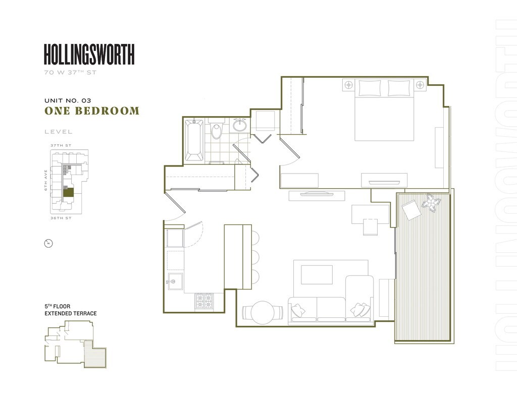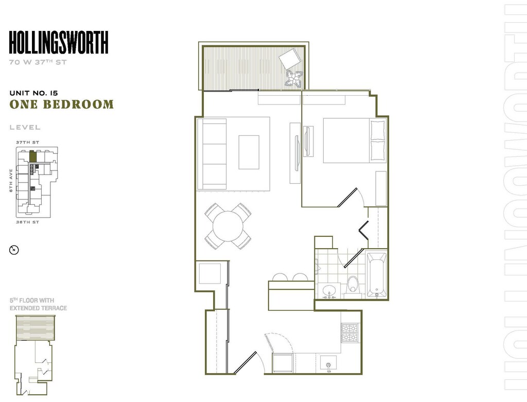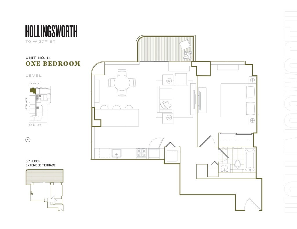 A pocas cuadras de Bryant Park, el Hollingsworth residencias querrás nada más en el centro de todo. Desde la inolvidable en la terraza de la azotea de arriba para cada amenidad de tus sueños a continuación, tu toda la emoción de Nueva York, actualizadas con un moderno estilo de vida en mente. Residencias cuidadosamente diseñadas para acomodar una cama King. Cocinas de chef profesional tienen cocinas a gas, refrigeradores y lavaplatos son de forma ordenada oculto detrás de gabinetes con paneles hechos a medida. Las cocinas también tienen gabinetes de cierre suave, encimeras de cuarzo y placa para salpicaduras de color gris, iluminación empotrada, y un amplio espacio de almacenaje. Cada residencia cuenta con lavadoras y secadoras por Bosch, con detalles de madera de roble, pisos de madera, duchas tipo lluvia y bañeras de inmersión de lujo con la mayoría de las residencias que cuenta con un espacio privado al aire libre.