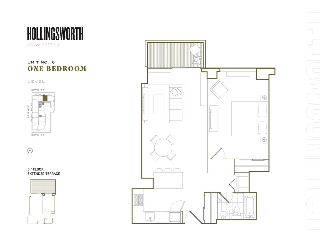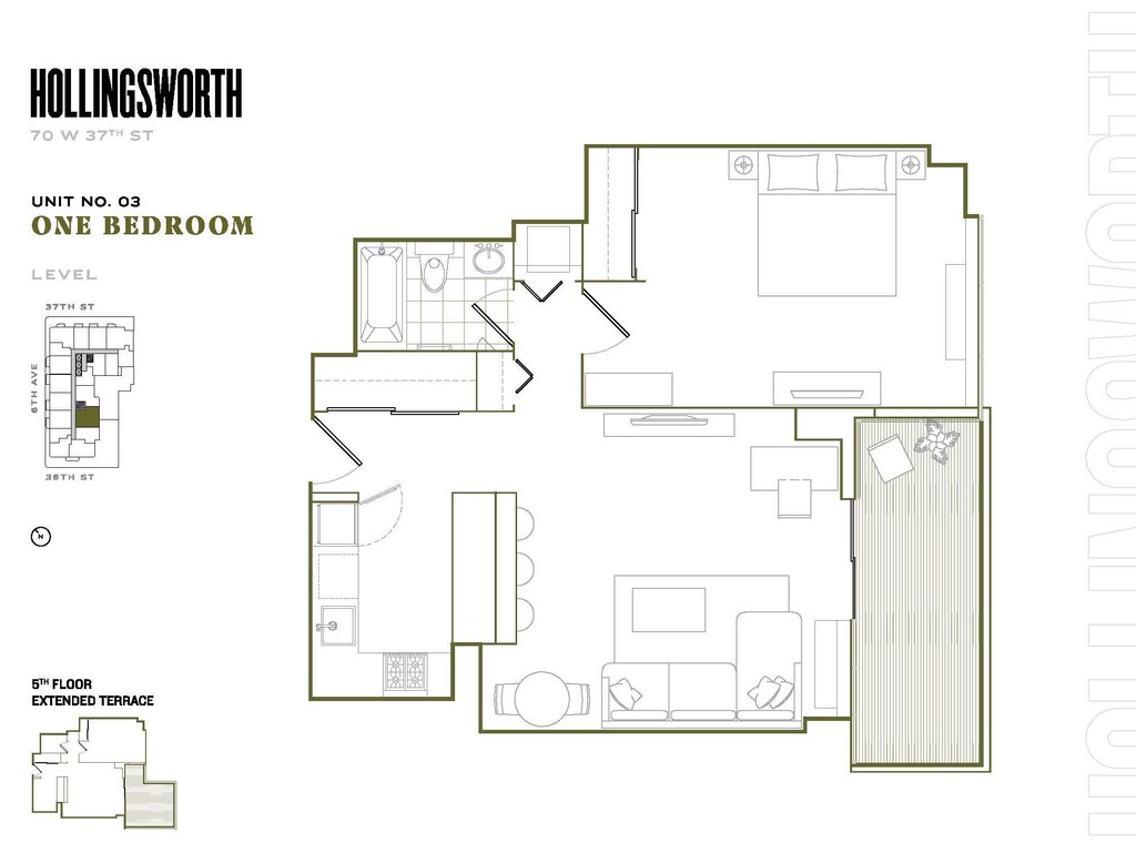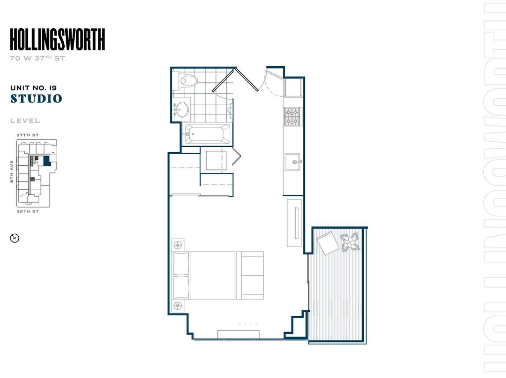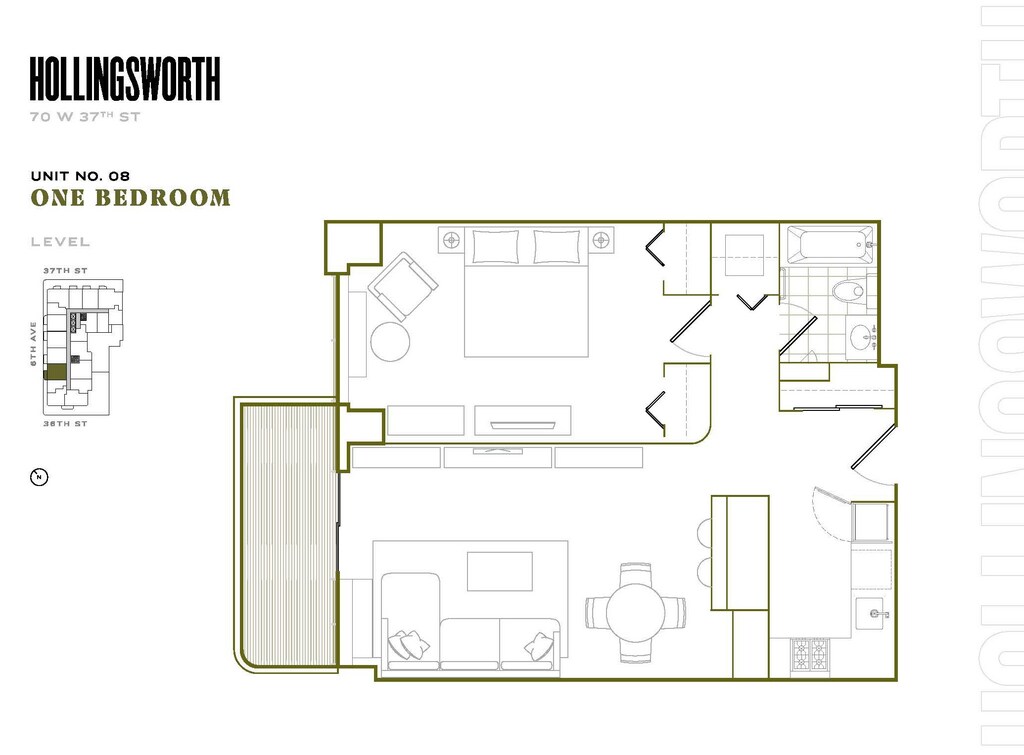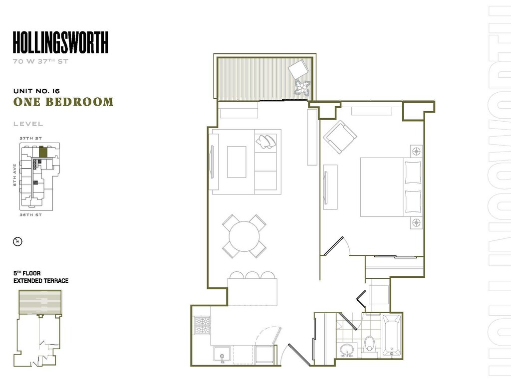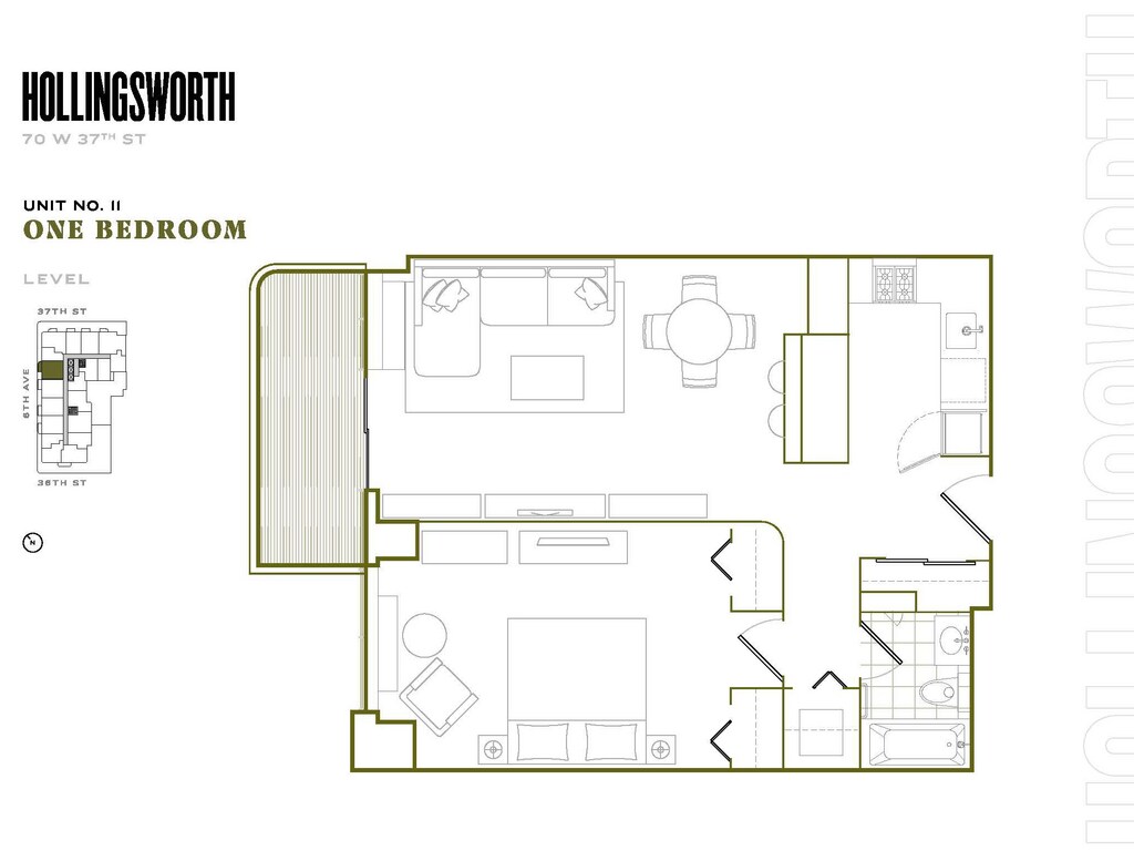 A pocas cuadras de Bryant Park, el Hollingsworth residencias querrás nada más en el centro de todo. Desde la inolvidable en la terraza de la azotea de arriba para cada amenidad de tus sueños a continuación, tu toda la emoción de Nueva York, actualizadas con un moderno estilo de vida en mente. Residencias cuidadosamente diseñadas para acomodar una cama King. Cocinas de chef profesional tienen cocinas a gas, refrigeradores y lavaplatos son de forma ordenada oculto detrás de gabinetes con paneles hechos a medida. Las cocinas también tienen gabinetes de cierre suave, encimeras de cuarzo y placa para salpicaduras de color gris, iluminación empotrada, y un amplio espacio de almacenaje. Cada residencia cuenta con lavadoras y secadoras por Bosch, con detalles de madera de roble, pisos de madera, duchas tipo lluvia y bañeras de inmersión de lujo con la mayoría de las residencias que cuenta con un espacio privado al aire libre.