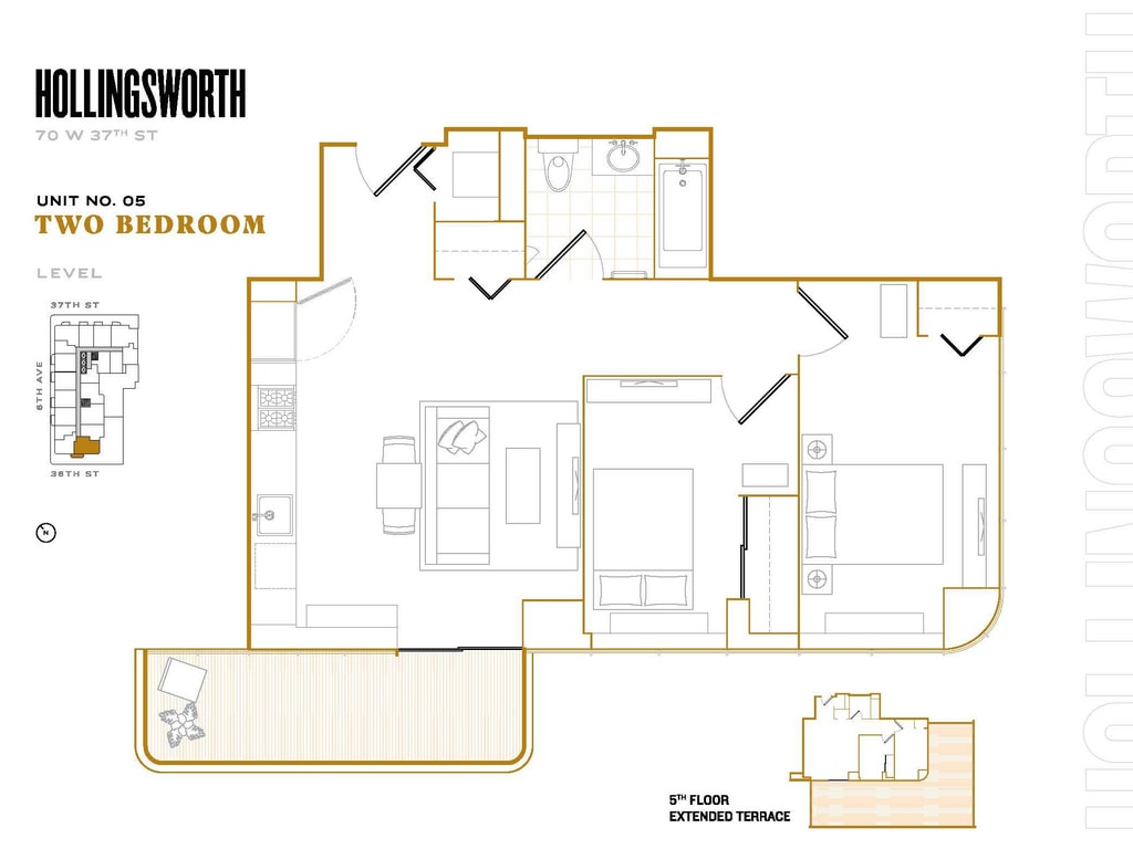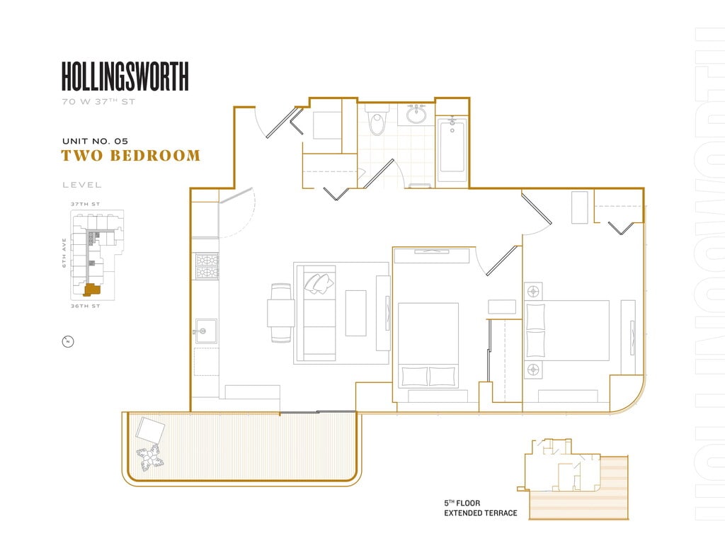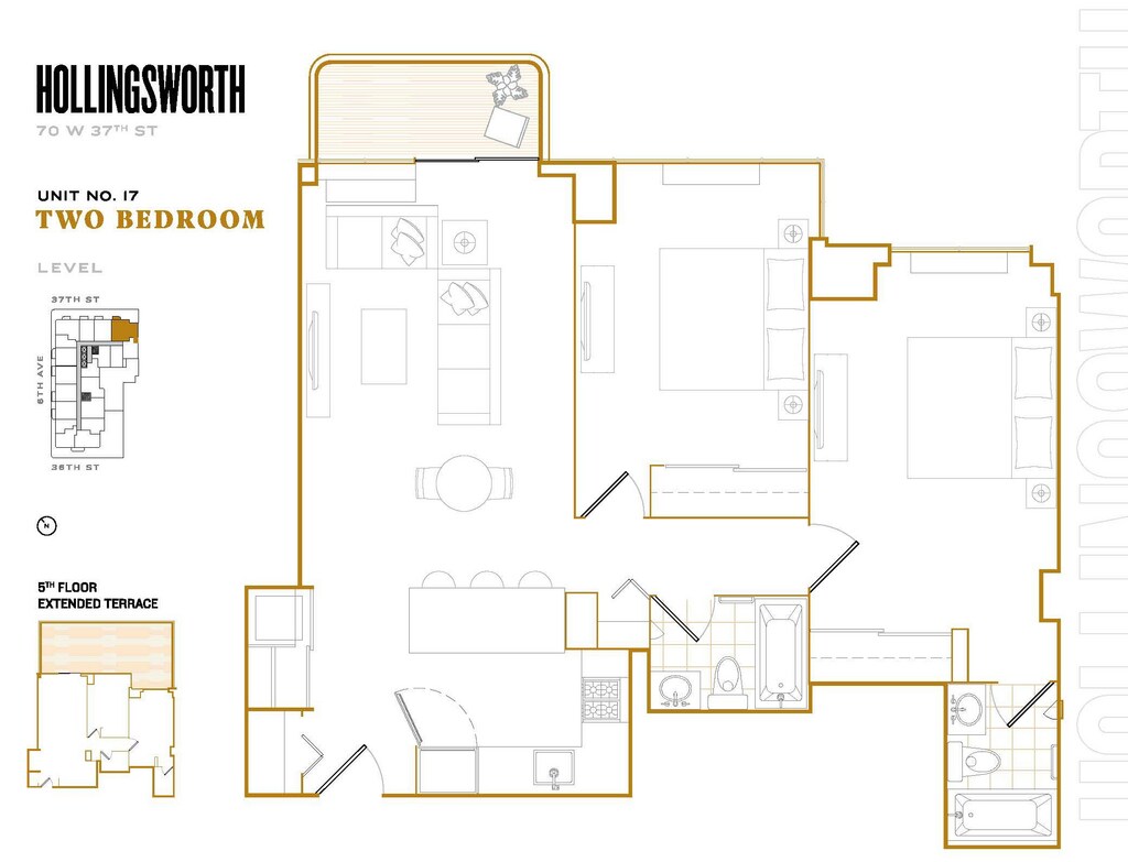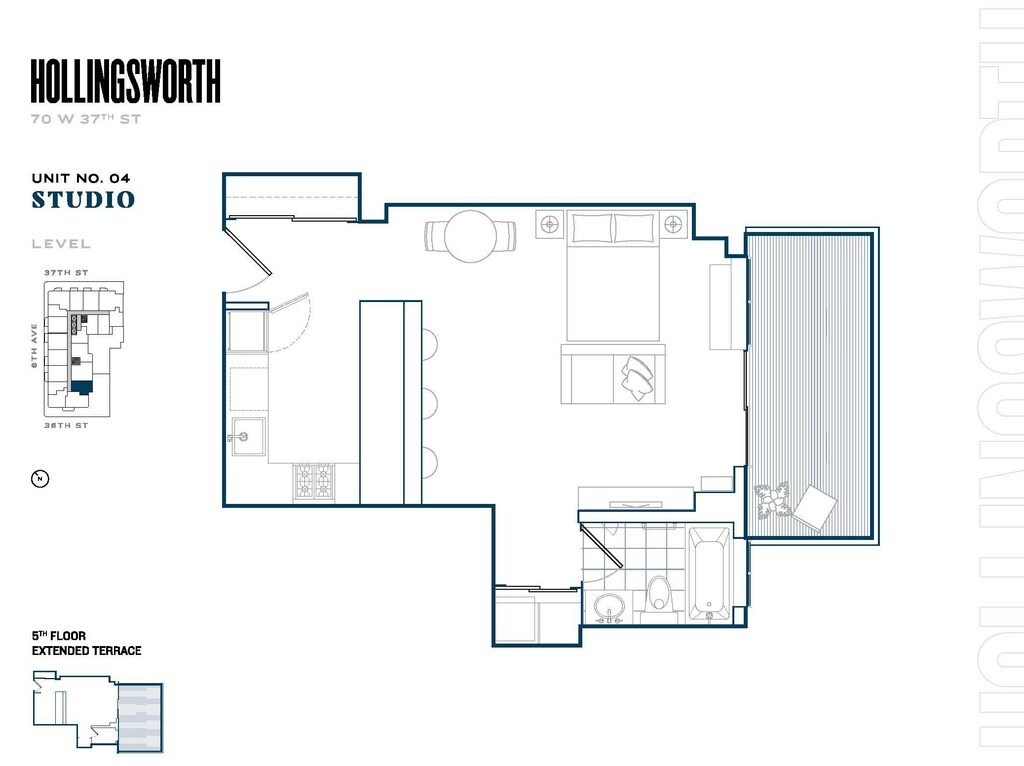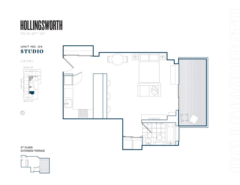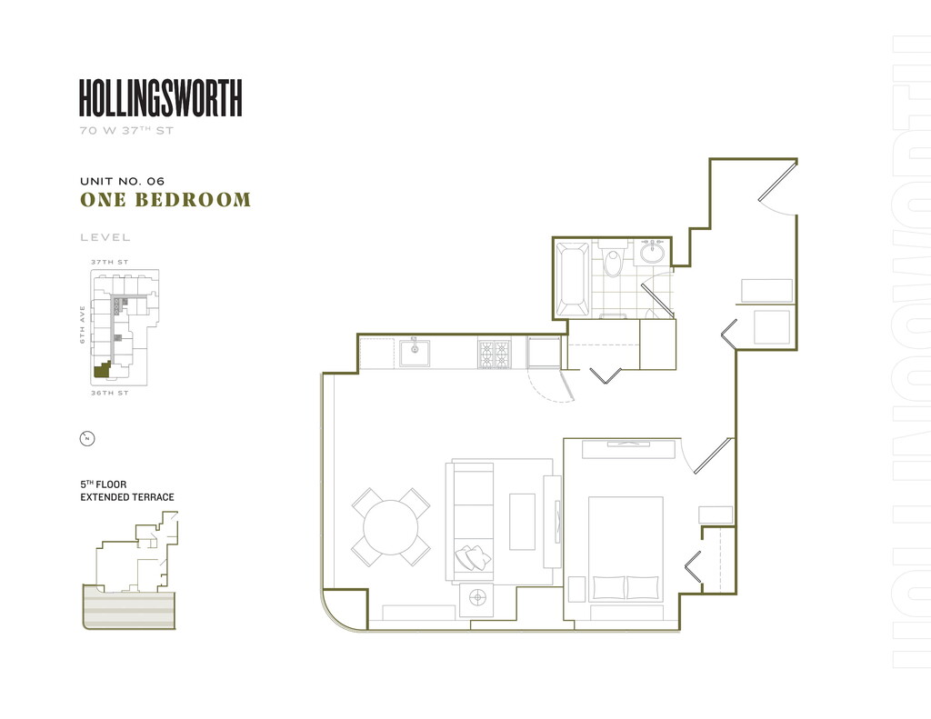 A pocas cuadras de Bryant Park, el Hollingsworth residencias querrás nada más en el centro de todo. Desde la inolvidable en la terraza de la azotea de arriba para cada amenidad de tus sueños a continuación, tu toda la emoción de Nueva York, actualizadas con un moderno estilo de vida en mente. Residencias cuidadosamente diseñadas para acomodar una cama King. Cocinas de chef profesional tienen cocinas a gas, refrigeradores y lavaplatos son de forma ordenada oculto detrás de gabinetes con paneles hechos a medida. Las cocinas también tienen gabinetes de cierre suave, encimeras de cuarzo y placa para salpicaduras de color gris, iluminación empotrada, y un amplio espacio de almacenaje. Cada residencia cuenta con lavadoras y secadoras por Bosch, con detalles de madera de roble, pisos de madera, duchas tipo lluvia y bañeras de inmersión de lujo con la mayoría de las residencias que cuenta con un espacio privado al aire libre.