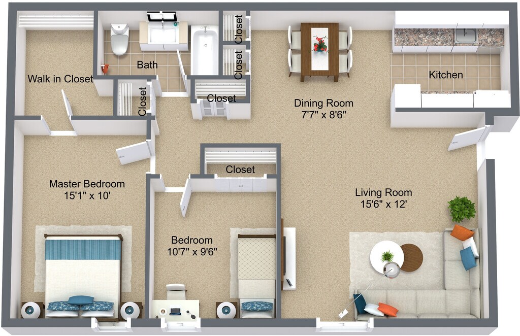 Modelo de apartamento: Two BedroomDesde $1,0152 Dormitorios, 1 Baño, 810 sq ftDisponible Ahora![]()