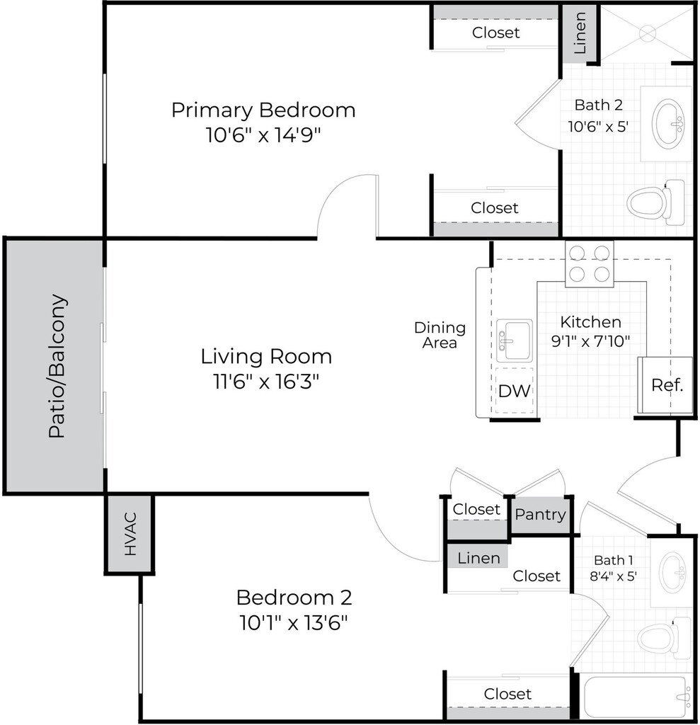 2 Beds, 1 Bath, 836 sq ftAvailable NowModel Gallery