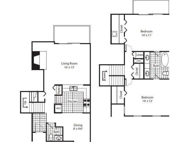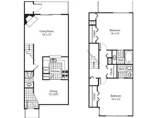 Modelo de apartamento: 2 Bed 2 BathDesde $1,2502 Dormitorios, 1.5 Baños, 1200 sq ftDisponible AhoraPlanosFotos![]()