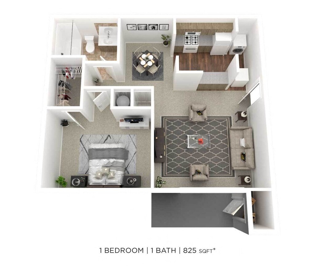 Modelo de apartamento: 1BR x 1BA, A1Desde $8751 Dormitorio, 1 Baño, 825 sq ftDisponible November 25, 2025![]()