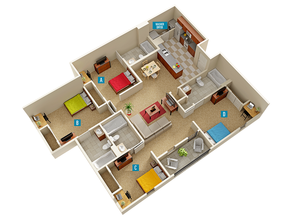 Modelo de apartamento: D1Desde $4754 Dormitorios, 4 Baños, 1312 sq ftDisponible Ahora![]()