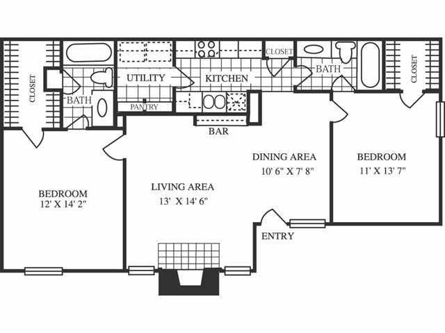 Modelo de apartamento: B22 Dormitorios, 2 Baños, 1000 sq ftNo DisponibleB2 - Plano 1