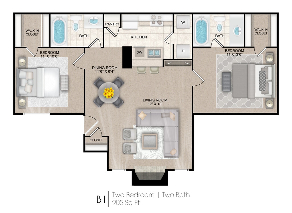 2 Dormitorios, 2 Baños, 905 pies²Disponible AhoraGalería del Modelo