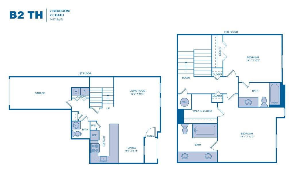 B2 TH - Floorplan 1 Apartment Unit: 35133513HApartment Model: B2 TH$2,9252 Bedroom, 2.5 Bath, 1417 sq ftAvailable NowApartment Unit: 33493349IApartment Model: B2 TH$2,8852 Bedroom, 2.5 Bath, 1417 sq ftAvailable January 9, 2026Apartment Unit: 34793479GApartment Model: B2 TH$2,9252 Bedroom, 2.5 Bath, 1417 sq ftAvailable February 25, 2026B3 TH Upgrade