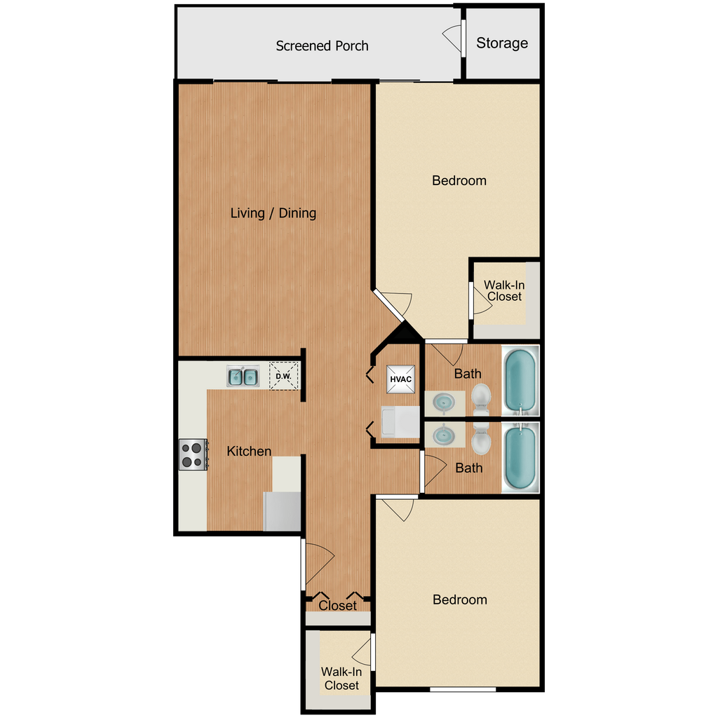 2 Dormitorios, 2 Baños, 1000 pies²Precio Mensual TotalDisponible AhoraGalería del Modelo