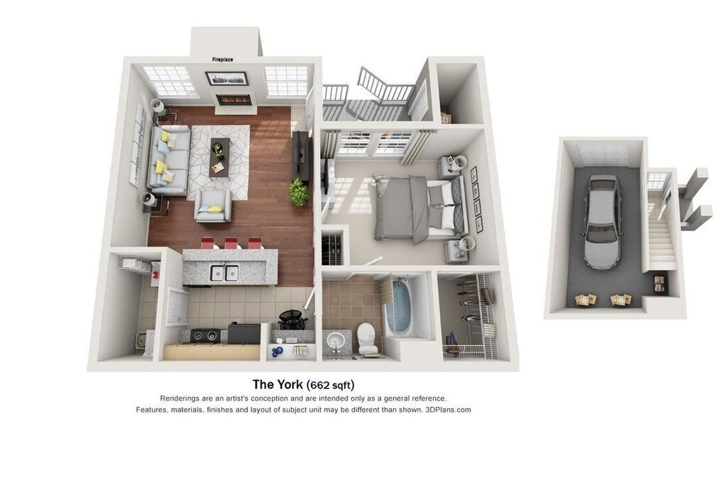 York w/Garage - Plano 1 Unidad de apartamento: B1925Modelo de apartamento: York w/Garage1 Dormitorio, 1 Baño, 662 sq ftDisponible AhoraYork