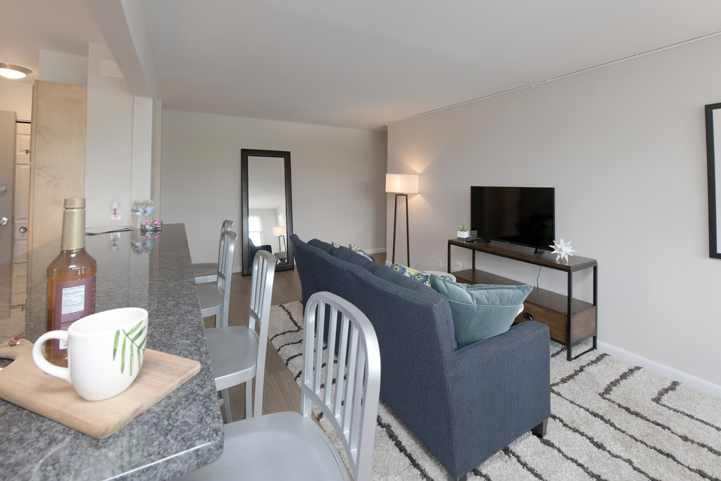 Sala de estar Newport: ¡Renovada! The Admiralty ofrece acabados de apartamento lujosos y la mayor cercanía al centro de la ciudad, a la Estación Naval de Newport y a las principales autopistas. Échales un vistazo a nuestros apartamentos recientemente renovados. Ahora estamos tomando reservas. Plano moderno - Lo mejor de Newport. Estos destacados apartamentos ofrecen planos decorados profesionalmente con encimeras de granito, pisos y alfombrado de diseñador, baños nuevos y renovados, iluminación contemporánea, y electrodomésticos de acero inoxidable. Plano exclusivo - Hermosas y acogedoras, estas residencias cuidadosamente renovadas cuentan con iluminación contemporánea, pisos de tablones de lujo, habitaciones alfombradas y baños renovados.
