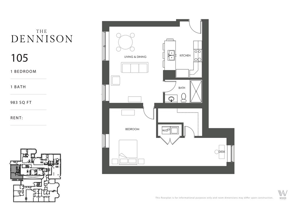 Dennison - 205 - Plano 1 Unidad de apartamento: 205Modelo de apartamento: Dennison - 2051 Dormitorio, 1.5 Baños, 1021 sq ftDisponible March 10, 2026![]()