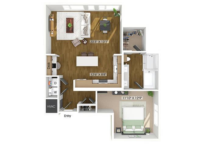 Modelo de apartamento: A2Desde $1,5651 Dormitorio, 1 Baño, 704-714 sq ftDisponible Ahora![]()