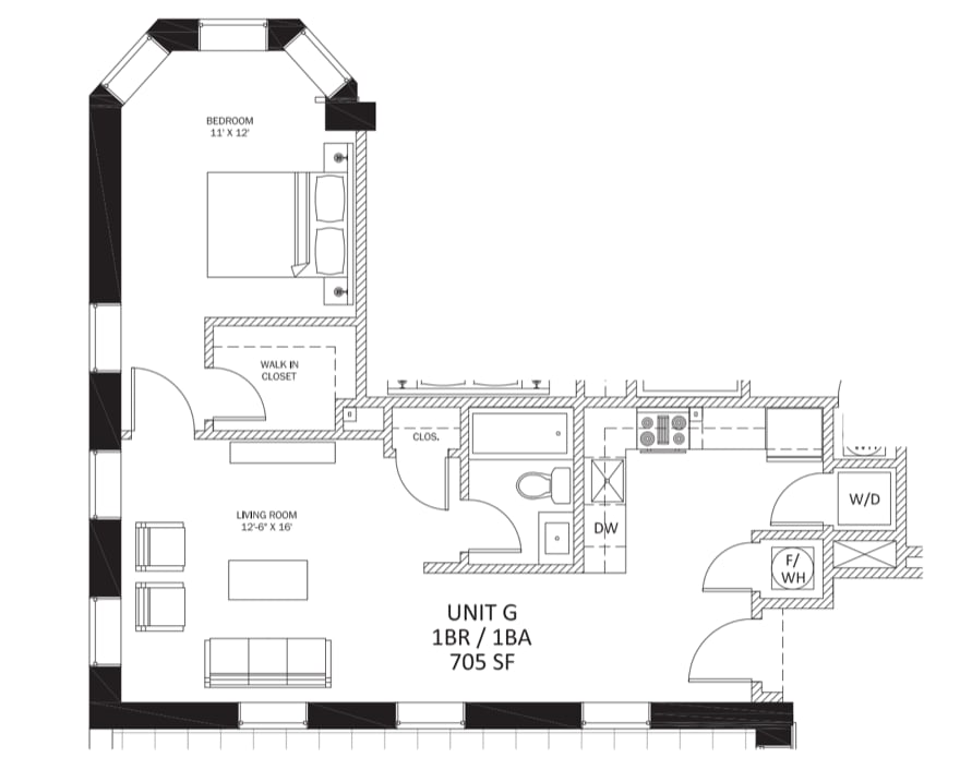 Modelo de apartamento: Floor Plan G$1,1601 Dormitorio, 1 Baño, 705 sq ftDisponible April 8, 2026![]()