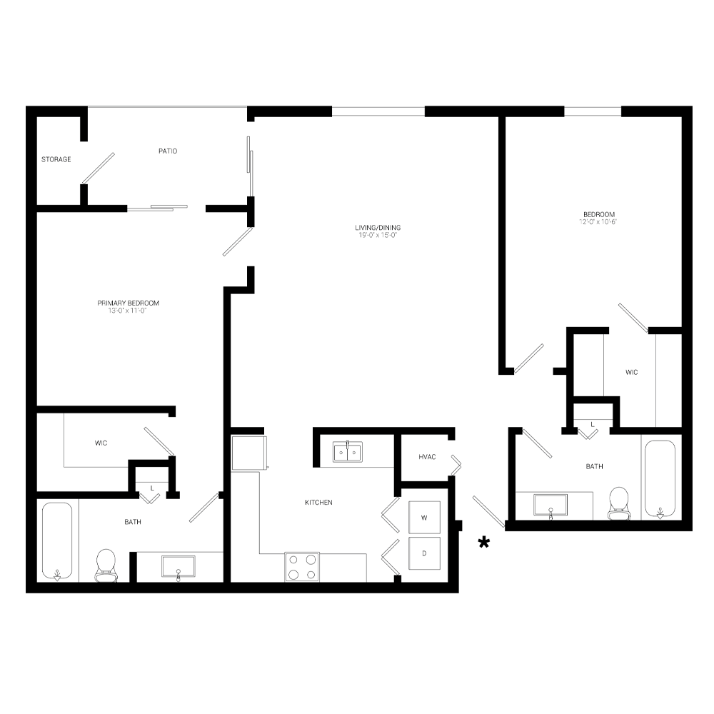Modelo de apartamento: The HideawayDesde $1,6552 Dormitorios, 2 Baños, 1000 sq ftDisponible AhoraLos planos son representaciones artísticas. Todas las dimensiones son aproximadas. El producto y las especificaciones reales pueden variar en tamaño o detalle. No todas las características están disponibles en cada vivienda en alquiler. Por favor, consulta con un representante para obtener más detalles.
