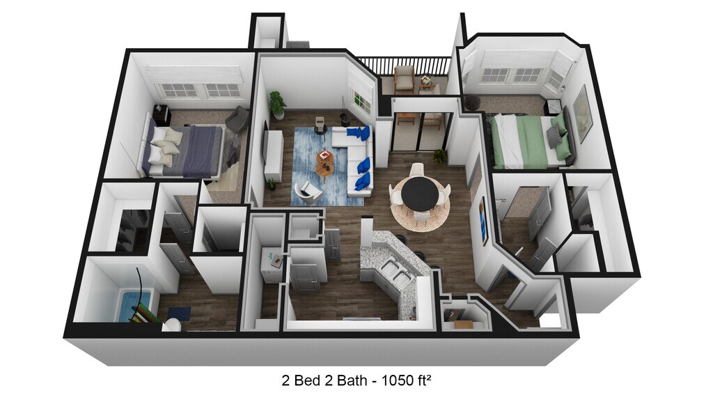 Modelo de apartamento: B1Desde $1,4992 Dormitorios, 2 Baños, 1050-1333 sq ftDisponible Ahora![]()
