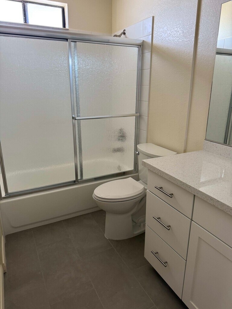 The townhome is located in Imperial Beach north of Palm Avenue. The townhome is a tri-level building with a 2 car garage on the first level. The second floor features the kitchen, living room, half bath, formal entry and a semi private deck. The third floor has 2 bedrooms with each having its own bath/shower. The stairway from the garage to the second level is shared with the adjacent unit. The unit for rent was completely remodeled. It has all new appliances, new countertops, new cabinets, new vanities, and new flooring.