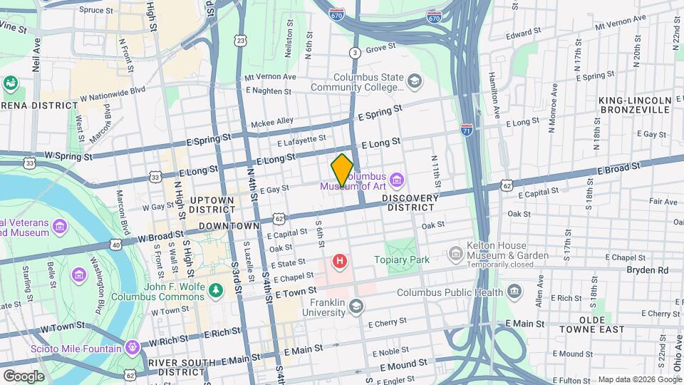 33 North Grant Avenue has 5 parks within 1.1 miles, including Topiary Park, Bicentennial/ Galbreath Park, Hoover Prairie, The House of Nightmares, and Scioto Mile.