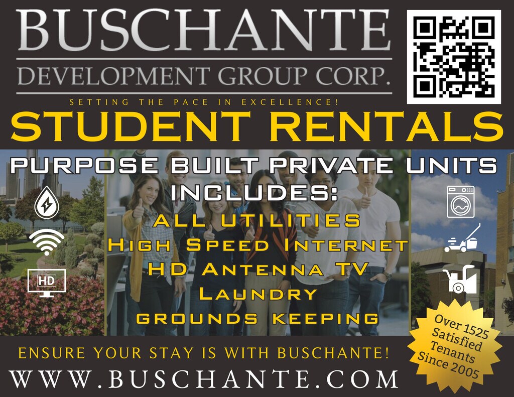 PREMIER, ALL-INCLUSIVE PRIVATE STUDENT RENTALS We offer 3, 4, 5 and 6 Bedroom Units. Apply Now for Sept. 2026! BRAND NEW BUILD MAY 1ST 2025! BUSCHANTE is proud to announce a NEW MODEL! 3 UNITS with 5 Beds, 2 Bath, Oversized Kitchens & Finest of Finishes BUSCHANTE DEVELOPMENT GROUP CORP has proudly served over 1600 students since 2005 providing private, all-inclusive, purpose-built residential units, leading the Windsor/Essex area in student housing, continually raising the caliber for UWindsor & St. Clair College students, both local and abroad. Only 10-15 Minute Walk to UWindsor & a 5 minute bus ride with multiple bus routes to St. Clair College as well! For walking and bus routes for both UWindsor & St. Clair College, visit Transit Windsor Website to Utilize the Trip Planner for specific Bus Routes & Times Etc. OUR UNIQUELY DESIGNED UNITS OFFER • A wide variety of layouts, all with generous sized bedrooms • ALL utilities included (GAS, HYDRO & WATER) with high end appliances and FREE ensuite laundry • 1GB highspeed INTERNET/WIFI with ethernet ports for direct connection • Parking & year-round grounds keeping • Quarterly Inspections guaranteeing a proactive approach to maintenance • Industry Leading IN-HOUSE Professional Property Management Team available 24/7 • A healthy student environment backed by positive policy enforcement Rental rates $650-$750 per person/Full Unit rate $1950-$4200. With a reputation boasting high referral rates from both students and parents alike, waitlists are typical each year so DON’T MISS OUT! Secure your spot in a Unit NOW by visiting our website and complete a BOOK A TOUR FORM for an immediate reply on next steps! Apply TODAY to ensure your stay with BUSCHANTE!