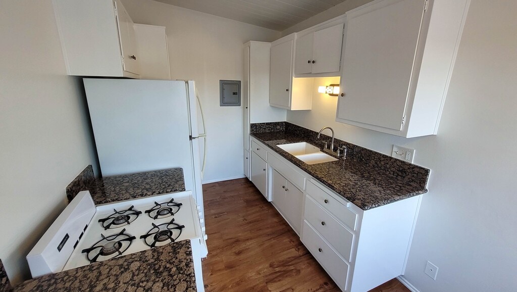 This Uptown Whittier upstairs two-bedroom one bath in a 5-unit building in a lovely garden setting. The kitchen features gorgeous granite countertops and a provided single door refrigerator and gas stove. The bathroom has new wood flooring and a new marble vanity. Wood flooring in the living room and kitchen with carpet in the bedrooms. New blinds, new wall heater, and comes with window AC units in the living room and both bedrooms! Comes with one carport, storage unit and access to on-site laundry facilities! Close to Uptown Whittier, The Groves for local shopping, dining, and seeing a movie!