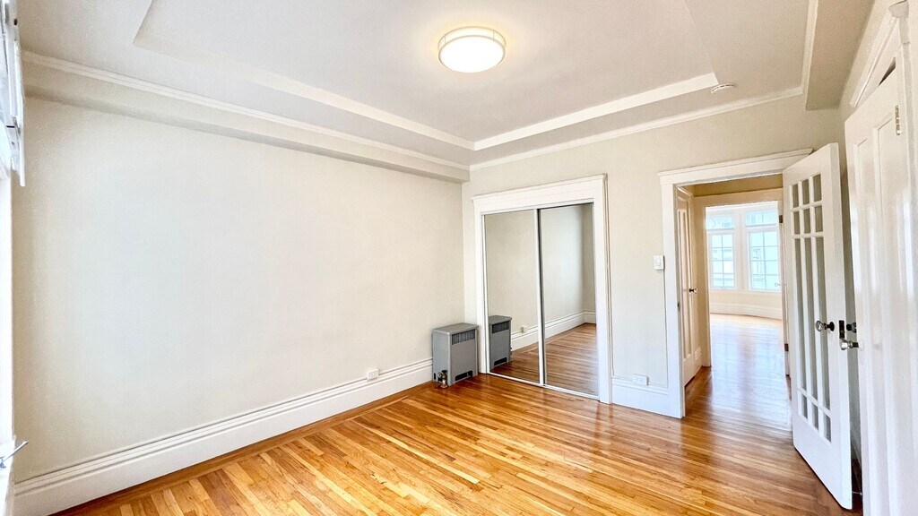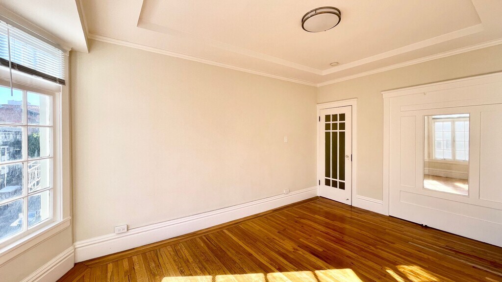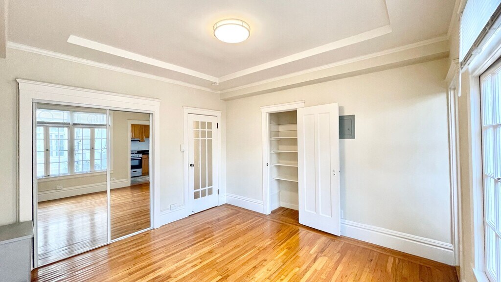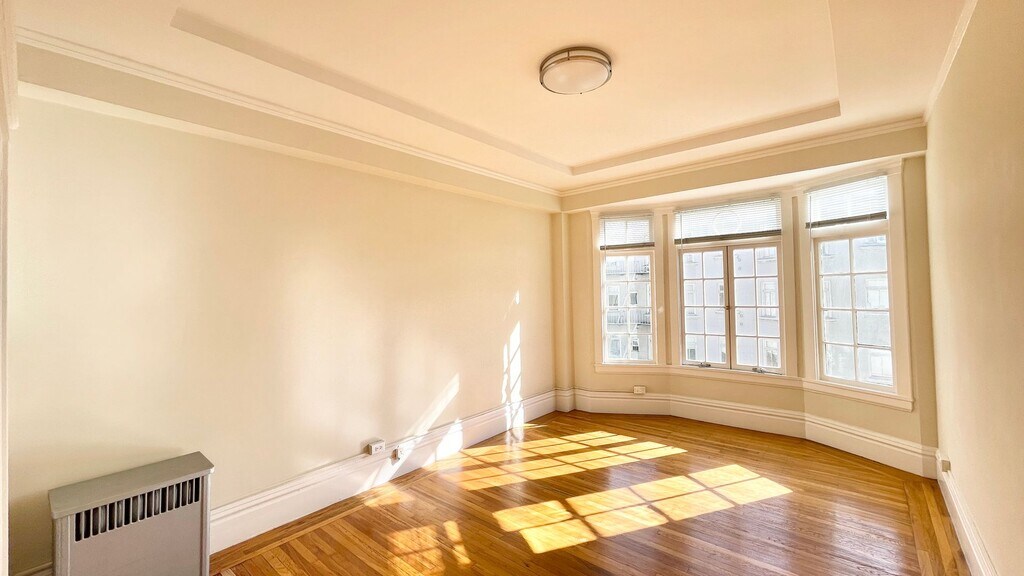 This charming and updated 1-Bedroom is spacious, light and airy, with great city views from the 5th floor! Fantastic layout with the bedroom separated from the living room by entry hallway. Large windows provide great natural light. Plentiful storage space with multiple closets, including a huge walk-in! Well-designed kitchen with lots of cabinets. Beautiful hardwood floors throughout. 890 Bush Apartments is a classic circa 1919 building and well-maintained to preserve its historic charm. Situated on the corner of Bush and Taylor Street in the Nob Hill neighborhood, you are a short walk away from Grace Cathedral and Trader Joe's. Conveniently located near the Financial District, and close to Union Square & Chinatown. Building amenities include an onsite Manager, coin-op laundry room, secure entrance, and elevator. There is no parking onsite but with a Walk Score of 99, Transit Score of 100 and a Bike Score of 62 (it is Nob Hill...) this is a pedestrian's paradise! A multitude of restaurants, grocery stores and entertainment options abound nearby. Well-behaved cats and dogs are welcome with additional pet deposit and monthly pet rent. Dogs require $500 pet deposit + $50/month pet rent, cats require $300 pet deposit + $25/month pet rent. Breed restrictions may apply, per owner's discretion. Utilities include water, trash, sewer and steam heat. Tenant responsible for their own metered PG&E. Non-smoking unit. 12 month lease required. This unit is a rental unit subject to the San Francisco Rent Ordinance, which limits evictions without just cause, and which states that any waiver by a tenant of their rights under the Rent Ordinance is void as contrary to public policy.