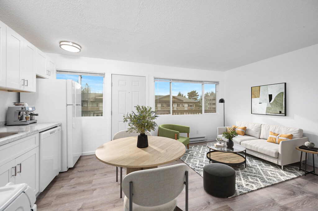 These two side-by-side communities feature ample laundry facilities, loads of parking and a bus line at the front door! Your choice of 2 interior floor plans conveniently located within walking distance of WWU and Sehome Village shopping center. 1 Bedroom and 1 Bathroom with separate custom vanity. Open style kitchen features a range, dishwasher and refrigerator. Custom cabinetry and counters complement the kitchen and vanity areas. Great sized bedroom and living room for all your apartment needs. 1 Bedroom and 1 Bathroom with separate vanity area. Compact efficiency kitchen with range, refrigerator and separate dining area. Please contact us for more information about our Tour availability at