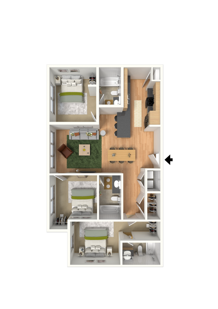 3x3 - Floorplan 4 Apartment Unit: PrivateApartment Model: 3x3$6053 Bedroom, 3 Bath, 1134 sq ftAvailable NowApartment Unit: PrivateApartment Model: 3x3$6053 Bedroom, 3 Bath, 1134 sq ftAvailable August 12, 20264 Bedrooms