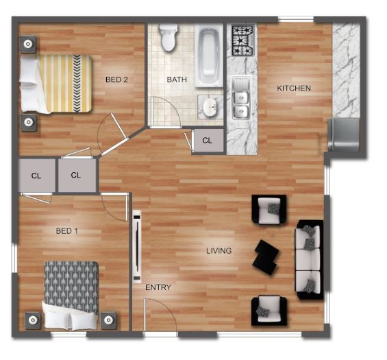 2 Beds, 1 Bath, 782 sq ftModel Gallery