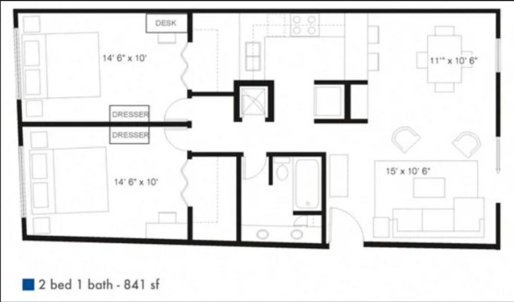 2 Beds, 1 Bath, 841 sq ftAvailability Details
