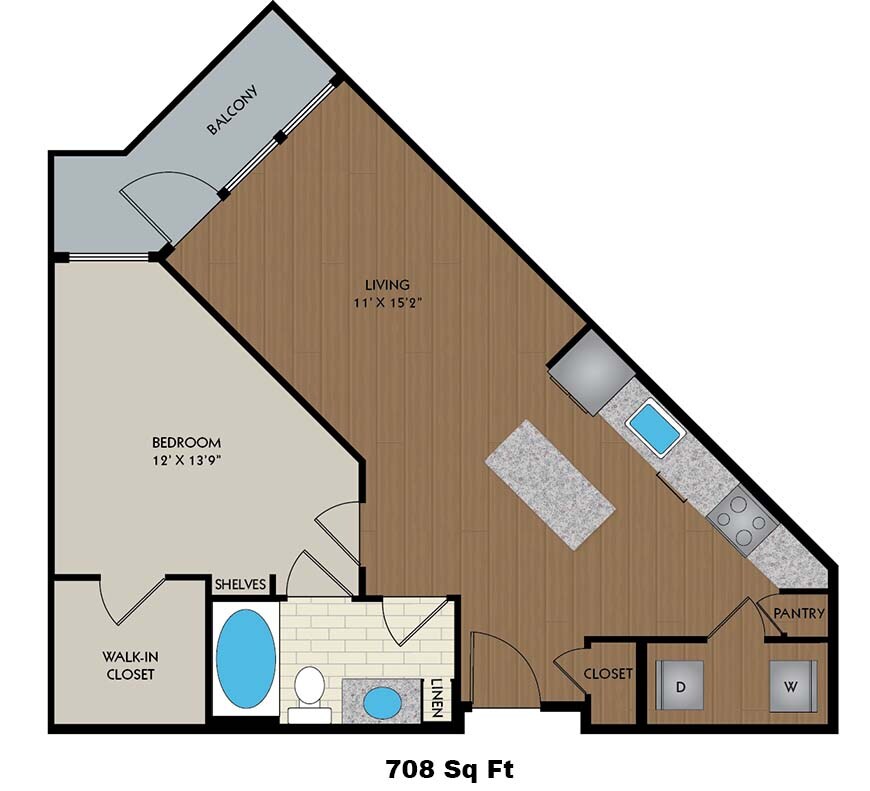 Apartment Model: A1AFrom $1,5121 Bedroom, 1 Bath, 708 sq ftAvailable NowFloor plans are artist's rendering. All dimensions are approximate. Actual product and specifications may vary in dimension or detail. Not all features are available in every rental home. Please see a representative for details.