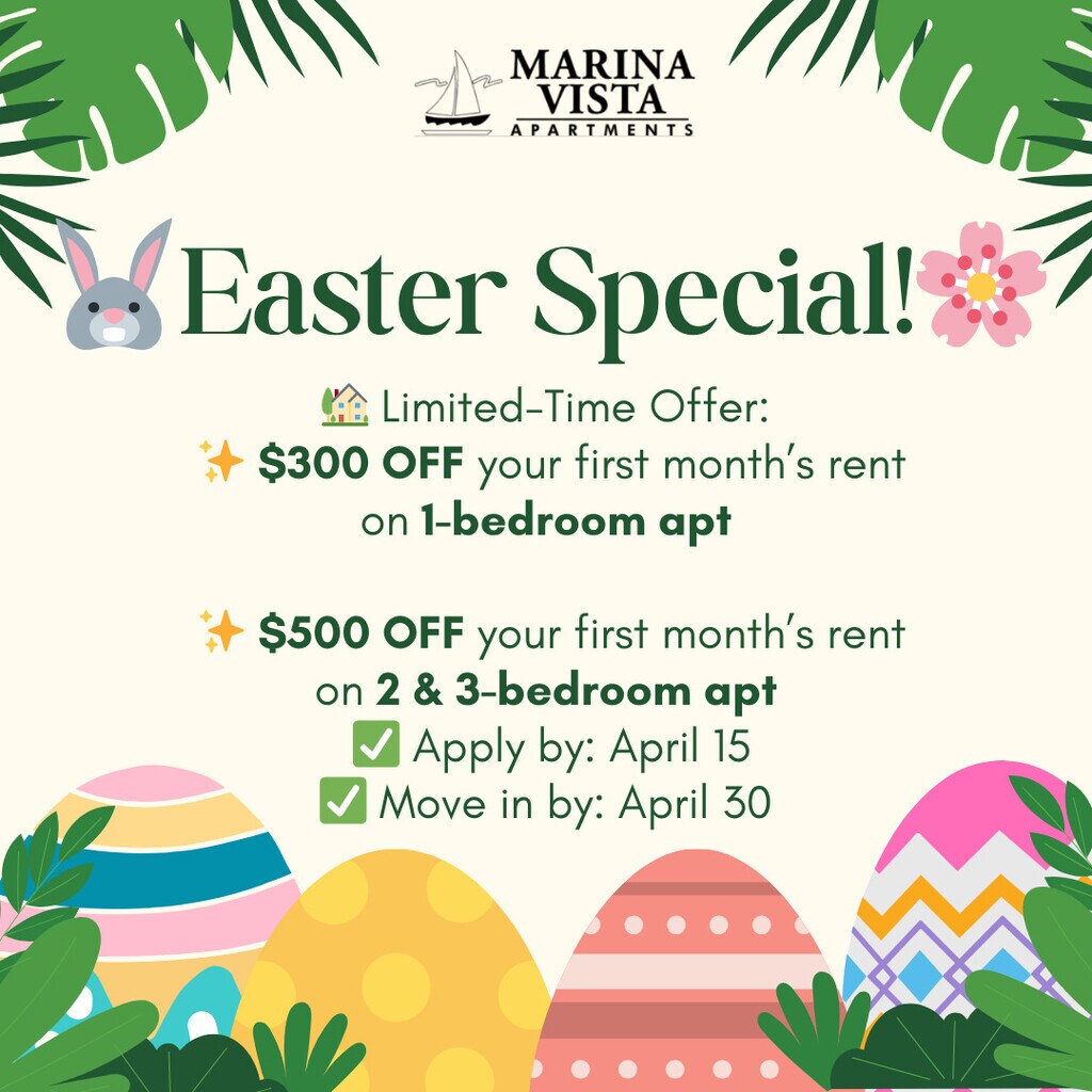 The current rent special at Marina Vista is: Spring Specials~~$250 Admin Fee Waived APPLY by March 15th and Move in by March 31st AND receive $500 off of first and second FULL months rent!!.