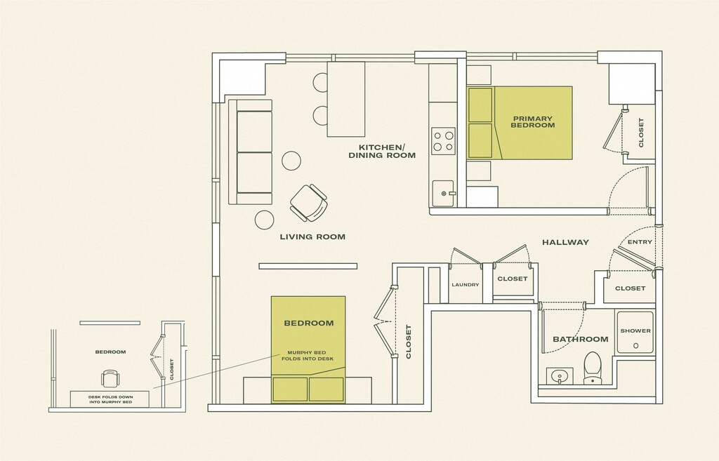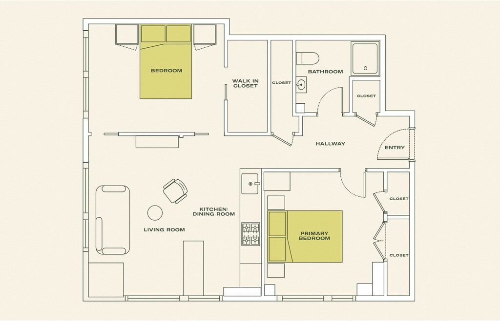 2 Beds, 1 Bath, 734 sq ftAvailable NowModel Gallery