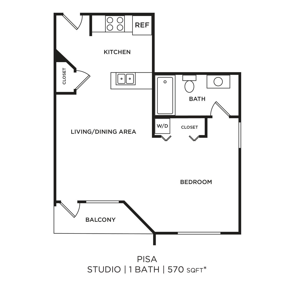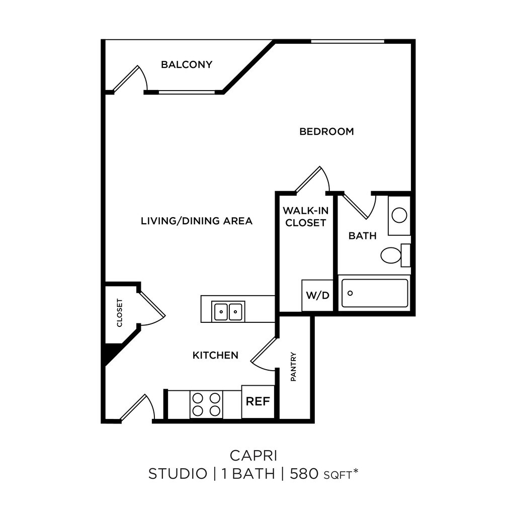 Studio-580 sqft - Floorplan 2 Apartment Unit: 130Apartment Model: Studio-580 sqft$1,725Studio, 1 Bath, 580 sq ftAvailable February 4, 20261 Bedroom