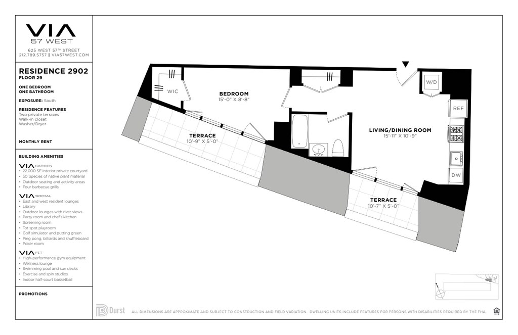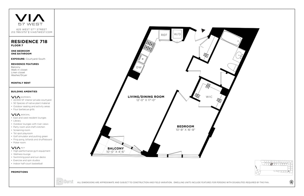 Designed by award-winning Bjarke Ingles Group, VIA 57 WEST offers a range of studio, one, two, three, and four-bedroom residences, many with private terraces. Spacious apartments, expansive amenities and a lush private resident courtyard balance the vibrant energy of Manhattan with the tranquility of nature, creating an iconic and visual gateway to New York. Unparalleled amenities, sophisticated fitness facilities, a 25-yard pool, and a central garden oasis enhance the living experience and wellbeing of VIA residents. Thoughtfully-curated resident programming and community events provide opportunities for residents to enjoy social interaction and an enhanced lifestyle. VIA 57 WEST’s human-centered approach blends environmental responsibility with resident wellness. All materials and construction techniques are carefully considered for resiliency, global impact and contribution to the health and productivity of our residents. FARE Act Disclosure. This listing is intended to be used by prospective renters and may not be republished without the prior written consent of The Durst Organization. Absent an express written agreement or acknowledgment to the contrary, The Durst Organization and its affiliates (1) do not utilize the services of third-party brokers or agents in connection with the rental of residential apartments and (2) will not assume responsibility for any brokerage fees incurred by a prospective renter. The Durst Organization and its affiliates will not charge or collect fees from a prospective renter except for such fees as permitted by law and disclosed to the prospective renter.