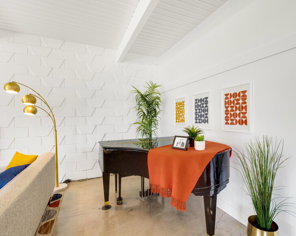 Here's your chance to experience one of the first William Krisel designs built in Sandpiper,Palm Desert. This mid-century modern features classic mid-century modern architectural details,including exposed concrete block walls,clerestory windows,and tongue & groove ceilings wood plank ceilings throughout. Natural light from the wall of windows in the living room brightens this home,and the east-facing patio offers serene views of the greenbelt,palm trees,and mountains. This home features beautiful,easy-to-maintain polished concrete floors and an updated kitchen and bathrooms. The kitchen is well-equipped and offers a gas range,a microwave/range hood,and everything you need to prepare a delightful meal to be enjoyed on your patio dining table. A cocktail cart is ready for you to serve up cocktails and wine pre-dinner. Located within walking distance of the finest shopping and dining in Palm Desert,including the fabulous Shops on El Paseo the ''Rodeo Drive of the Desert'' you'll have easy access to some of the best restaurants in the area. And many of the area's best hiking trails are just a few minutes away. Monthly Rental Rates: January - April $5,000,May $4,000,June - September $3,500,October - December $4,000. MLS # 219082815