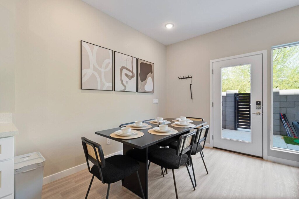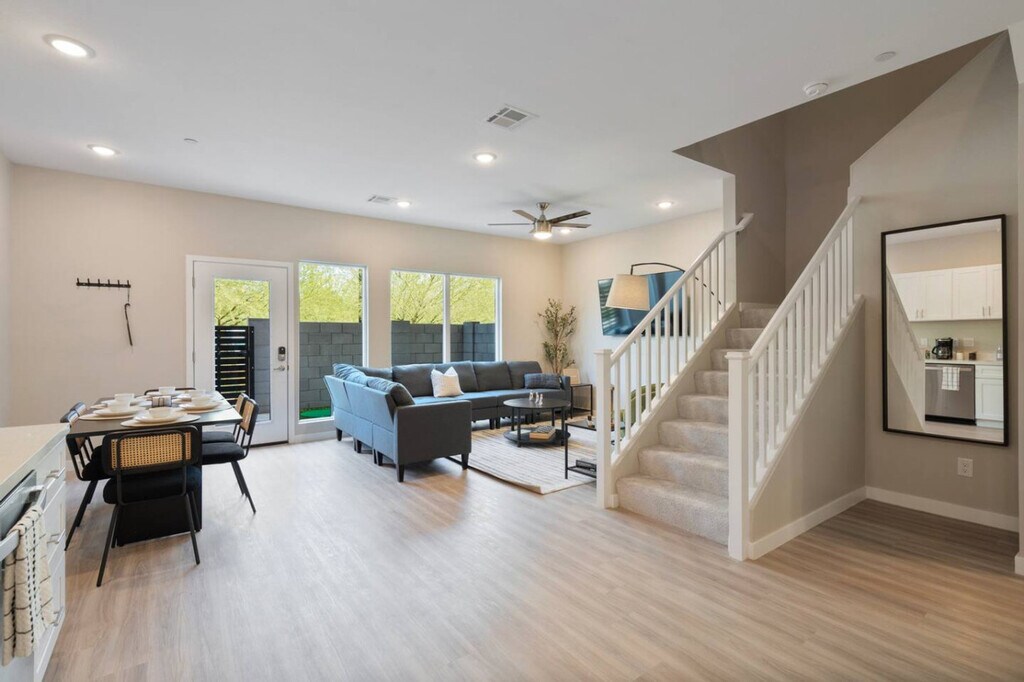 Feel at home in this spacious suite, just minutes from Surprise Stadium. This new townhome has room for everyone to relax. This apartment features a private outdoor area with a putting green and games, a 65" smart TV, comfortable couches, a fully equipped kitchen, plush bedding, new stainless steel appliances, utensils, pots and pans, coffee mugs, a coffee maker and coffee filters, a kettle and tea bags, wine glasses and an opener. The bathrooms include a modern half-bathroom on the main level, a full bathroom upstairs with a glass shower door, and an en-suite full bathroom with a bathtub. There is easy access to the garage and some fun games in the unit. Guests can also enjoy the common area with a barbeque and seasonally heated pool close to the unit. There is a $10 fee per guest after 5 guests in each unit. Centrally located for all your activities planned for your trip to Surprise, the surrounding area of Surprise Stadium offers a blend of sports facilities, outdoor spaces, dining options, and entertainment venues, creating a vibrant and dynamic environment for residents and visitors alike. In addition to the stadium, the Surprise Recreation Campus features several recreational facilities such as baseball fields, soccer fields, basketball courts, and playgrounds. The Surprise Tennis and Racquet Complex is situated adjacent to the stadium. Surprise Community Park provides green spaces, picnic areas, walking trails, and a fishing lake. There are numerous dining options nearby, ranging from fast-food chains to casual dining restaurants, and several shopping centers and retail outlets are within a short driving distance. Visitors attending events at Surprise Stadium have access to various hotels and accommodations in the vicinity. No shoes are to be worn inside the home, especially on the carpeted areas. Quiet hours start at 10 pm on weeknights and 11 pm on weekends, and end at 7 am. Evidence of pets inside the property will result in a $100 fine charged to guests. Parties and/or large noisy social gatherings are prohibited, and there is a $250 surcharge charged to groups that are deceitful about the use of the house. Guests partying will be asked to vacate the property immediately without refund. Smoking is not allowed indoors, and you will be fined $500 if you violate this policy. A surcharge of $100 per undeclared guest per night will be applied for unapproved guests. There is a $75 cleaning fee for any pets. An $50.00/hour penalty will be applied if you fail to check-out by 10am or by the agreed upon check-out time. Includes a comfortable office chair and a desk with a lamp. [SI]